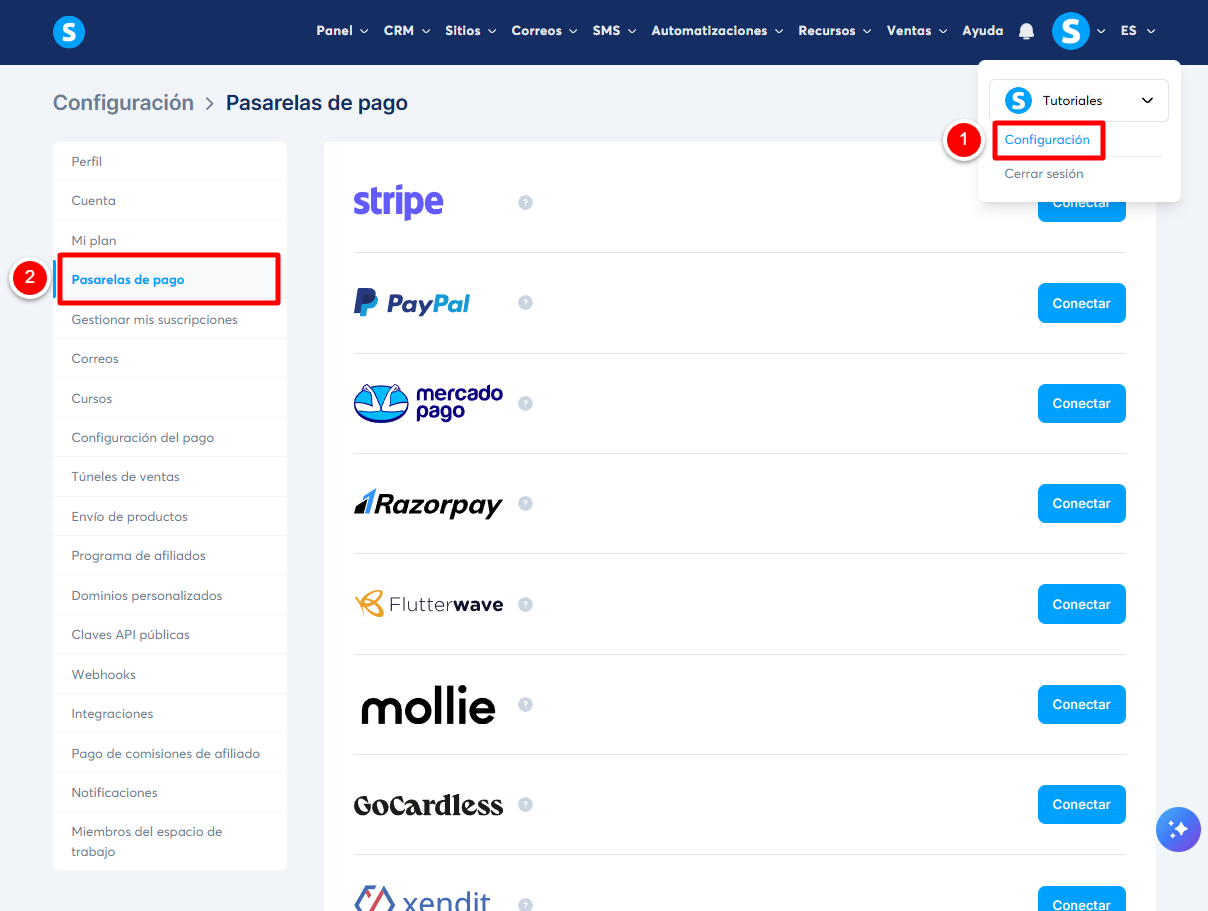 Para conectar una cuenta de Mercado Pago, debes ir a tu foto de perfil, hacer clic en "Configuración" (1) y luego en el menú izquierdo "Pasarelas de pago" (número 2).