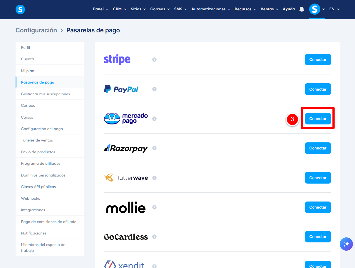 En la sección pasarelas de pago haz clic en "Conectar" (3) en la opción de Mercado Pago.