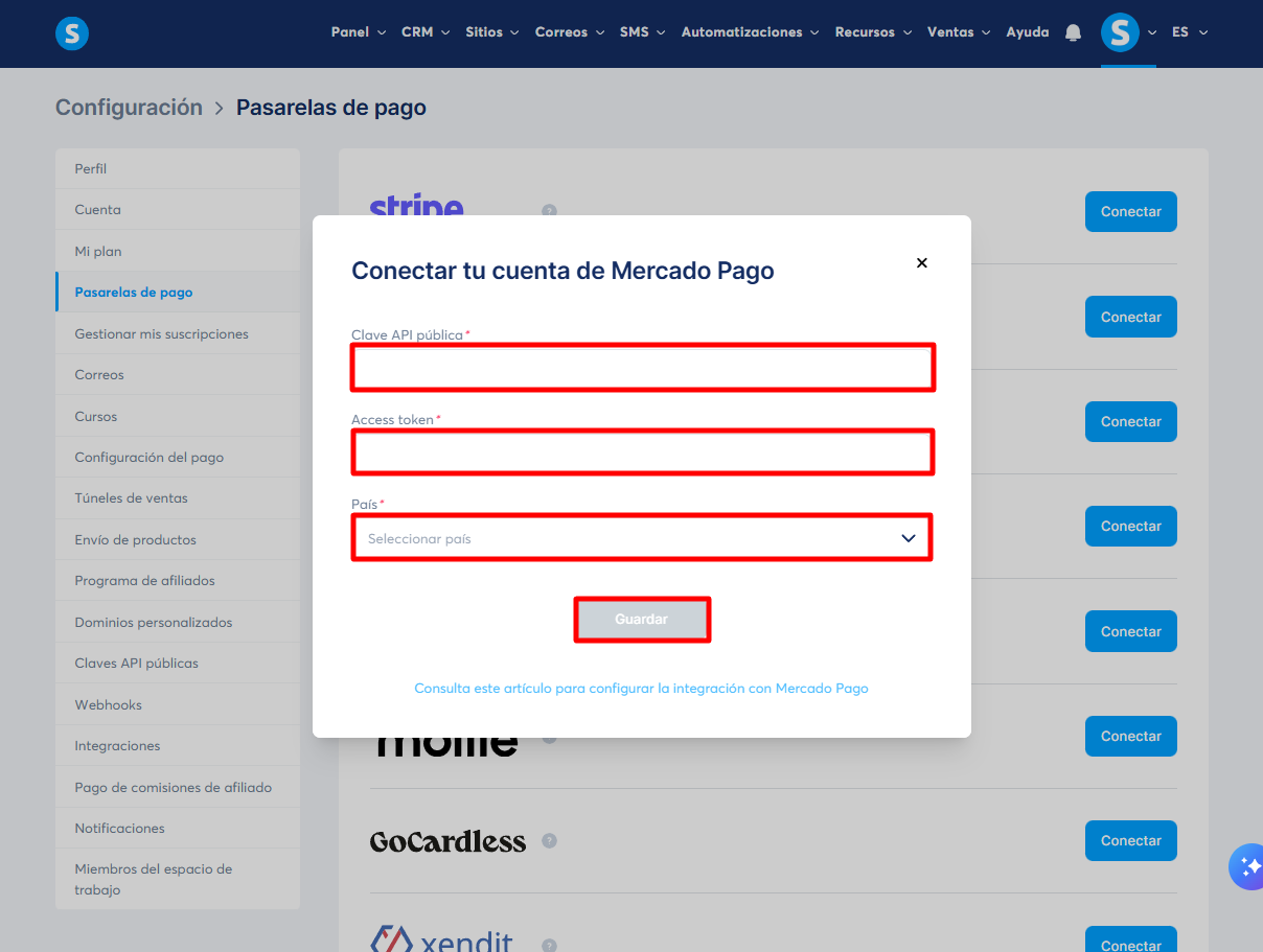 Estas son las credenciales que debes ingresar en tu cuenta de systeme.io para conectar Mercado Pago como método de pago: