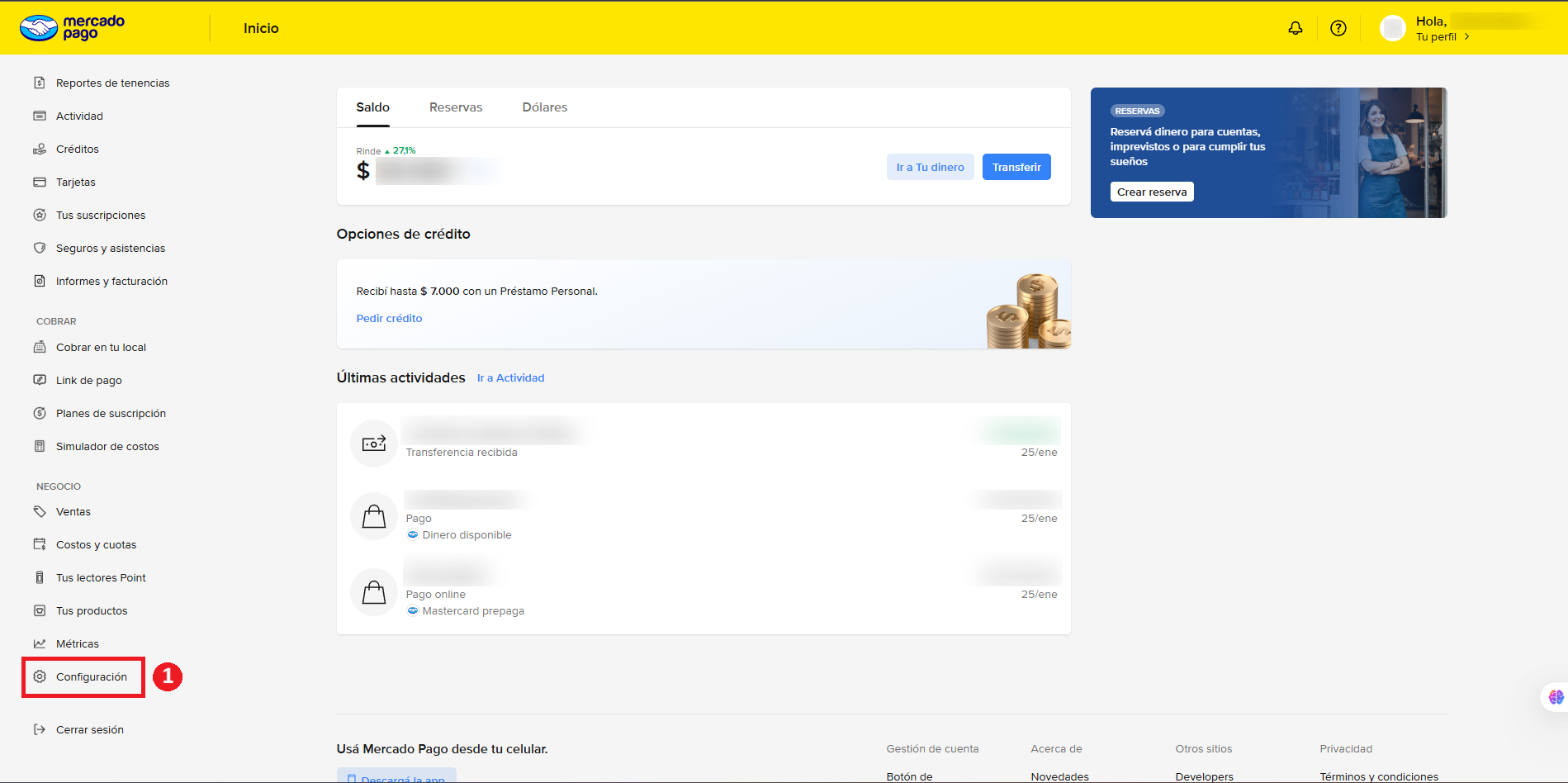 1.1. En el panel principal de tu cuenta de Mercado Pago, haz clic en "Tu negocio" (número 3) y luego en "Configuración" (1).