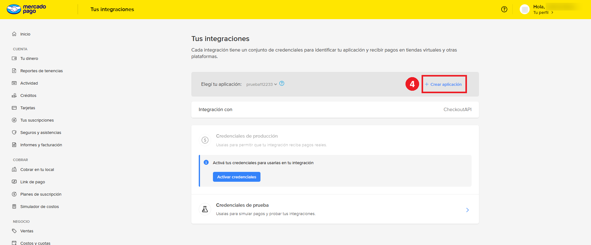 1.4 Crea una aplicación para generar estas credenciales haciendo clic en "Crear aplicación" (4)