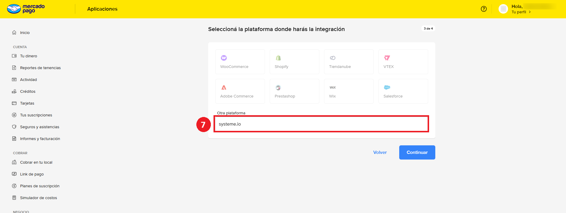 - En Selecciona la plataforma donde realizarás la integración, elige "Otras plataformas" (7).