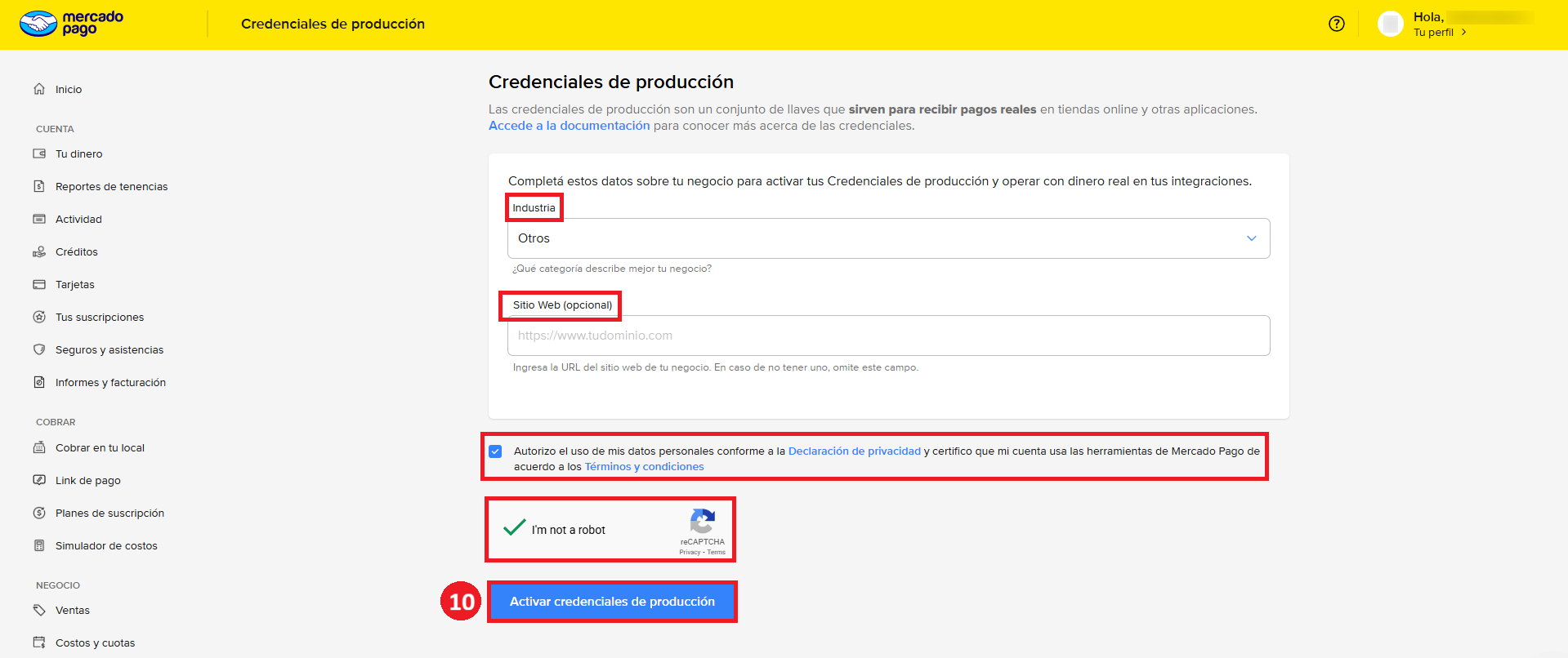 Finalmente, haz clic en el botón azul "Habilitar credenciales de producción" (10)