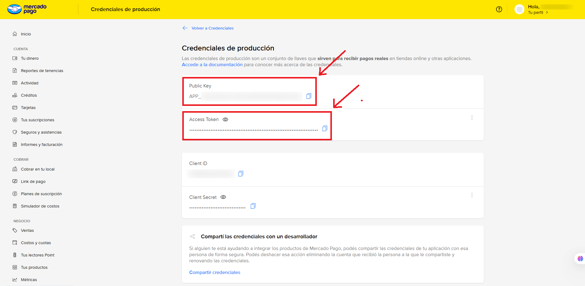 1.7 Mercado Pago generará las siguientes credenciales de producción: