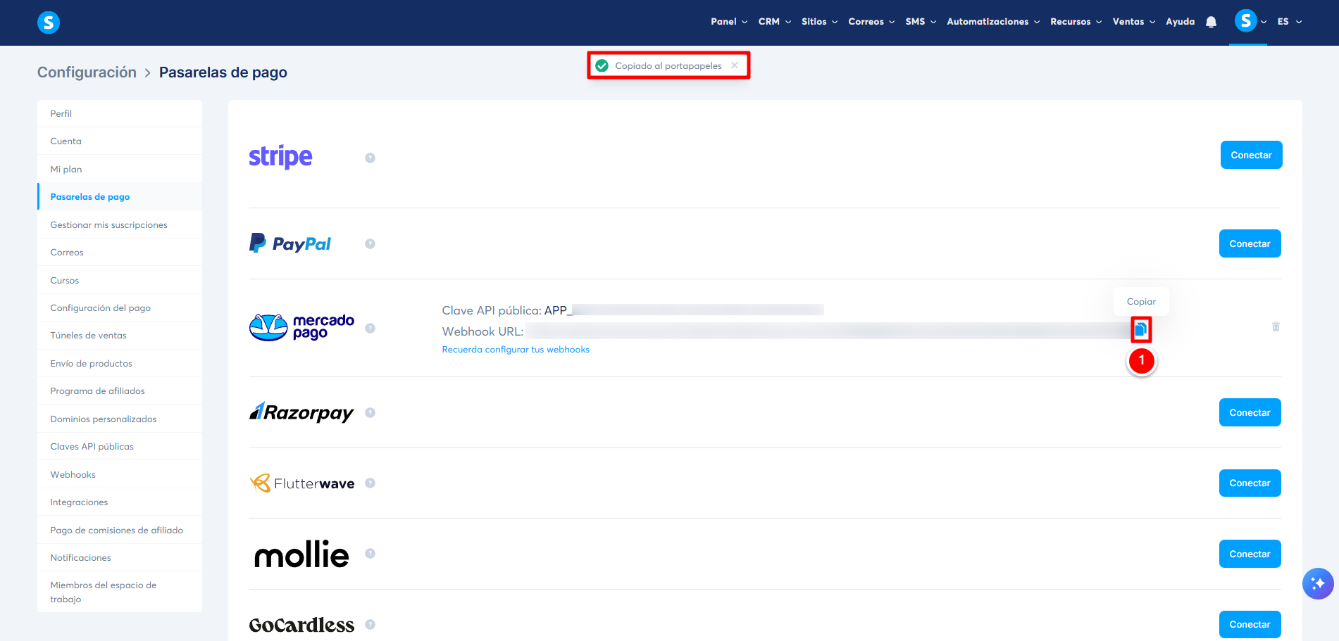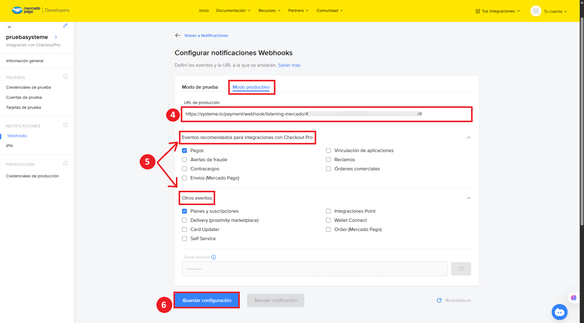 Una vez completada la integración, recibirás una URL de webhook que debe ser ingresada en el panel de Mercado Pago para permitir que systeme.io procese los eventos de pago.