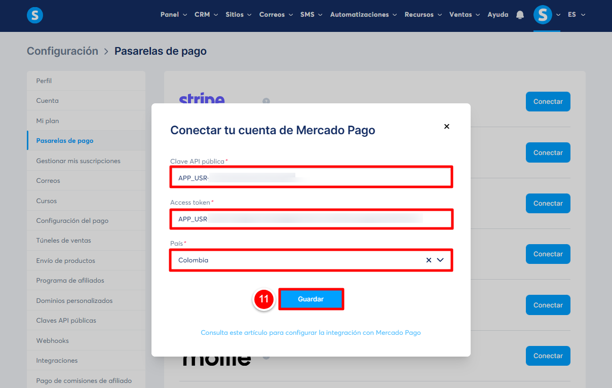 1.8 Una vez generada la aplicación y las credenciales, regresa a tu cuenta de systeme.io, ingrésalas y haz clic en Guardar (11).