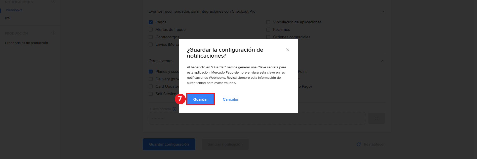 Se mostrará una ventana emergente para guardar la configuración del webhook; haz clic en Guardar (7) para confirmar.