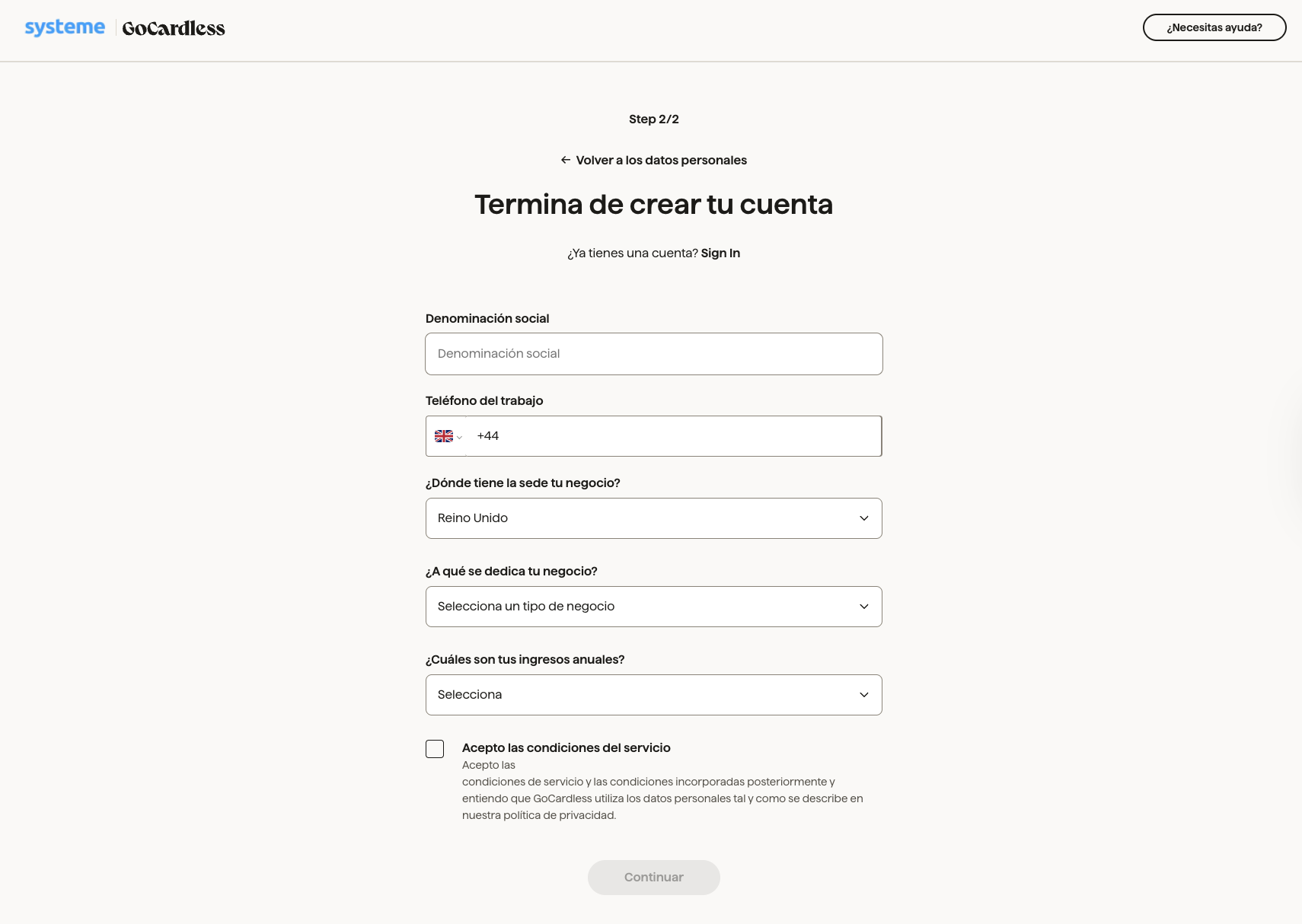 Serás redireccionado a una página que te permite iniciar sesión en tu cuenta de GoCardless o crear una cuenta si aún no tienes una.