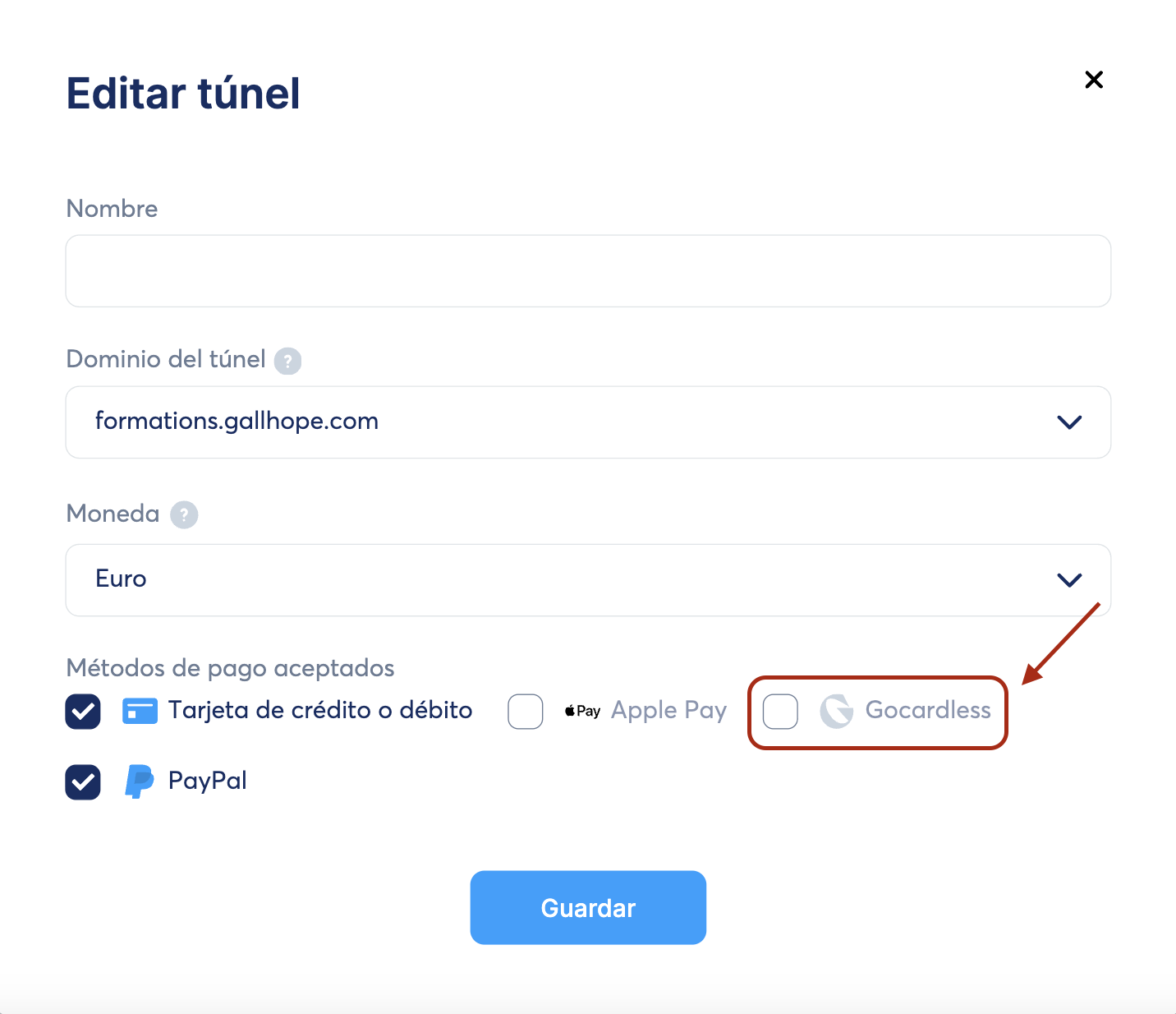 Luego de completar el formulario, activa GoCardless como método de pago en la configuración de tus túneles de venta haciendo clic en la casilla GoCardless.