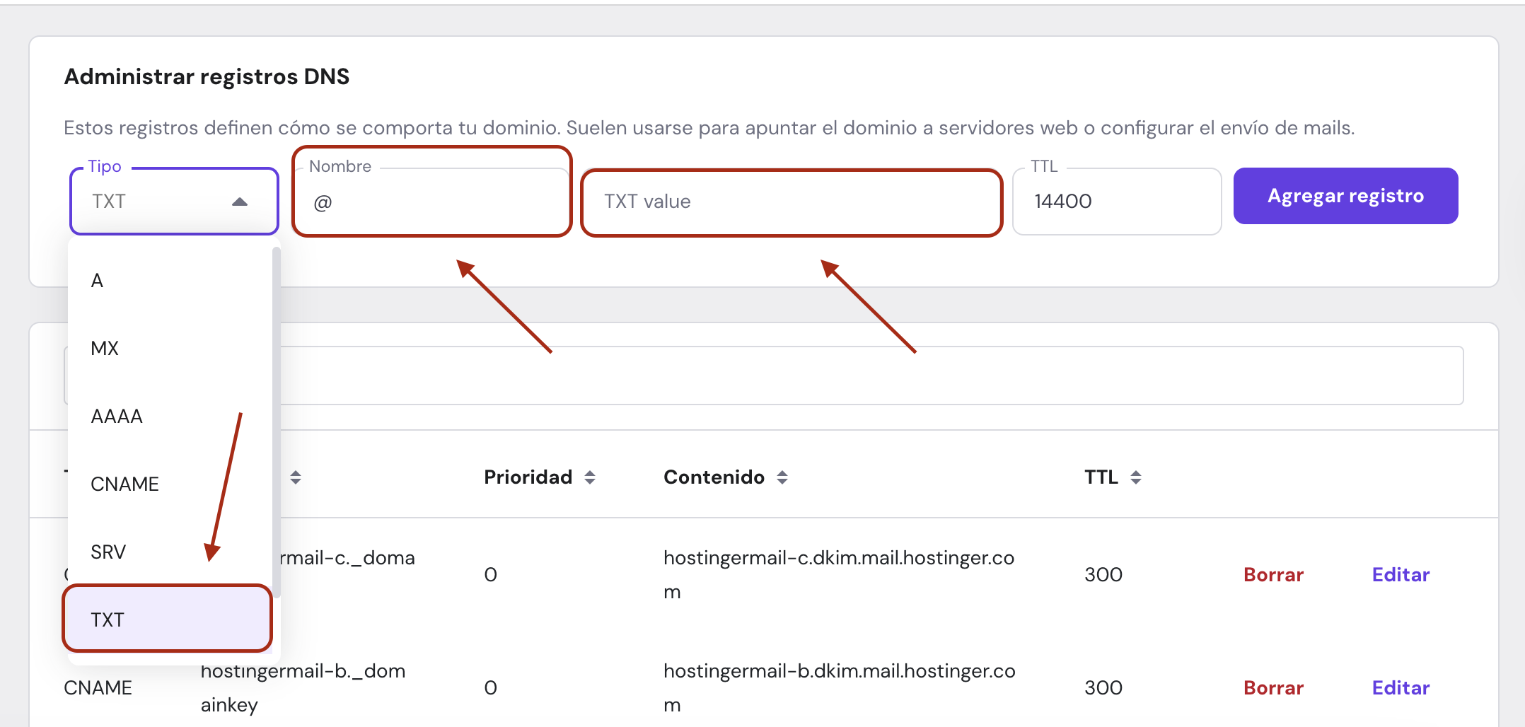 1. Crea un registro TXT. Después de iniciar el proceso de creación del registro, ingresa un nombre y un valor para el registro.