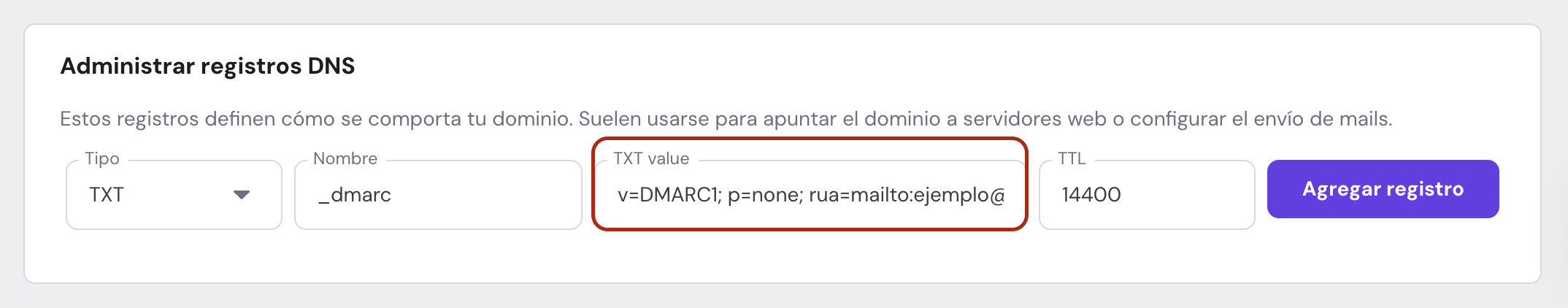 Si tu dirección de correo electrónico es "ejemplo@ejemplo.com", necesitas añadir el valor "v=DMARC1; p=none; rua=mailto:ejemplo@ejemplo.com".