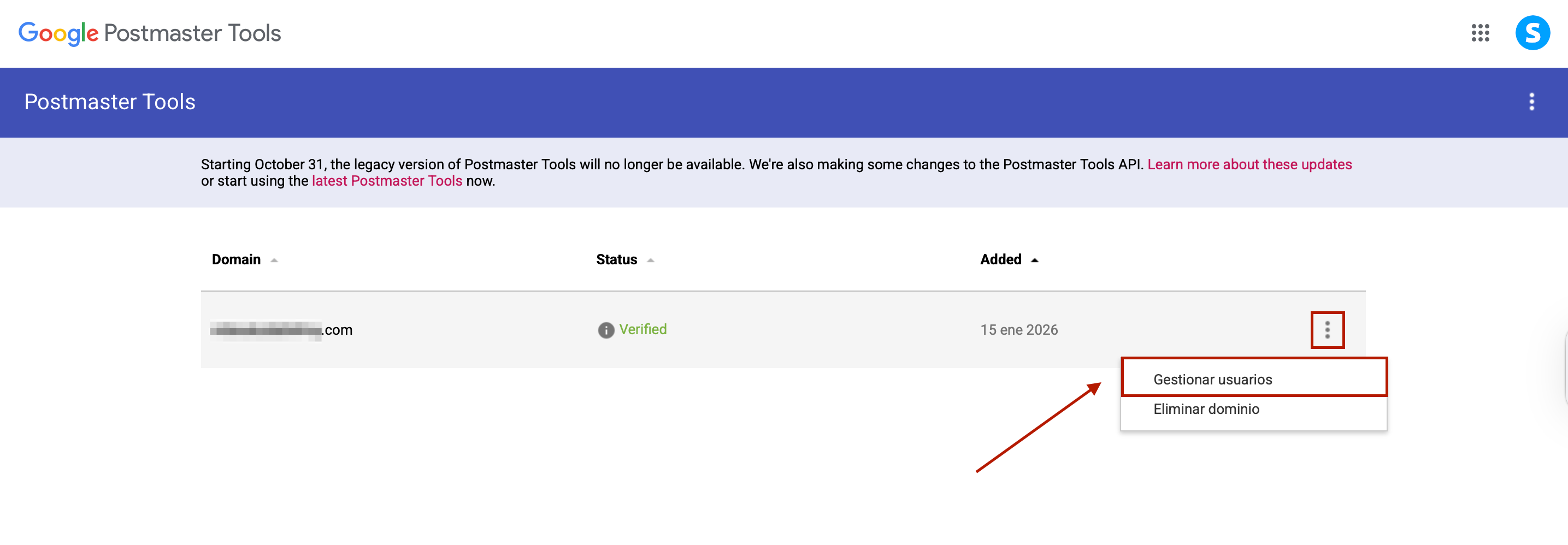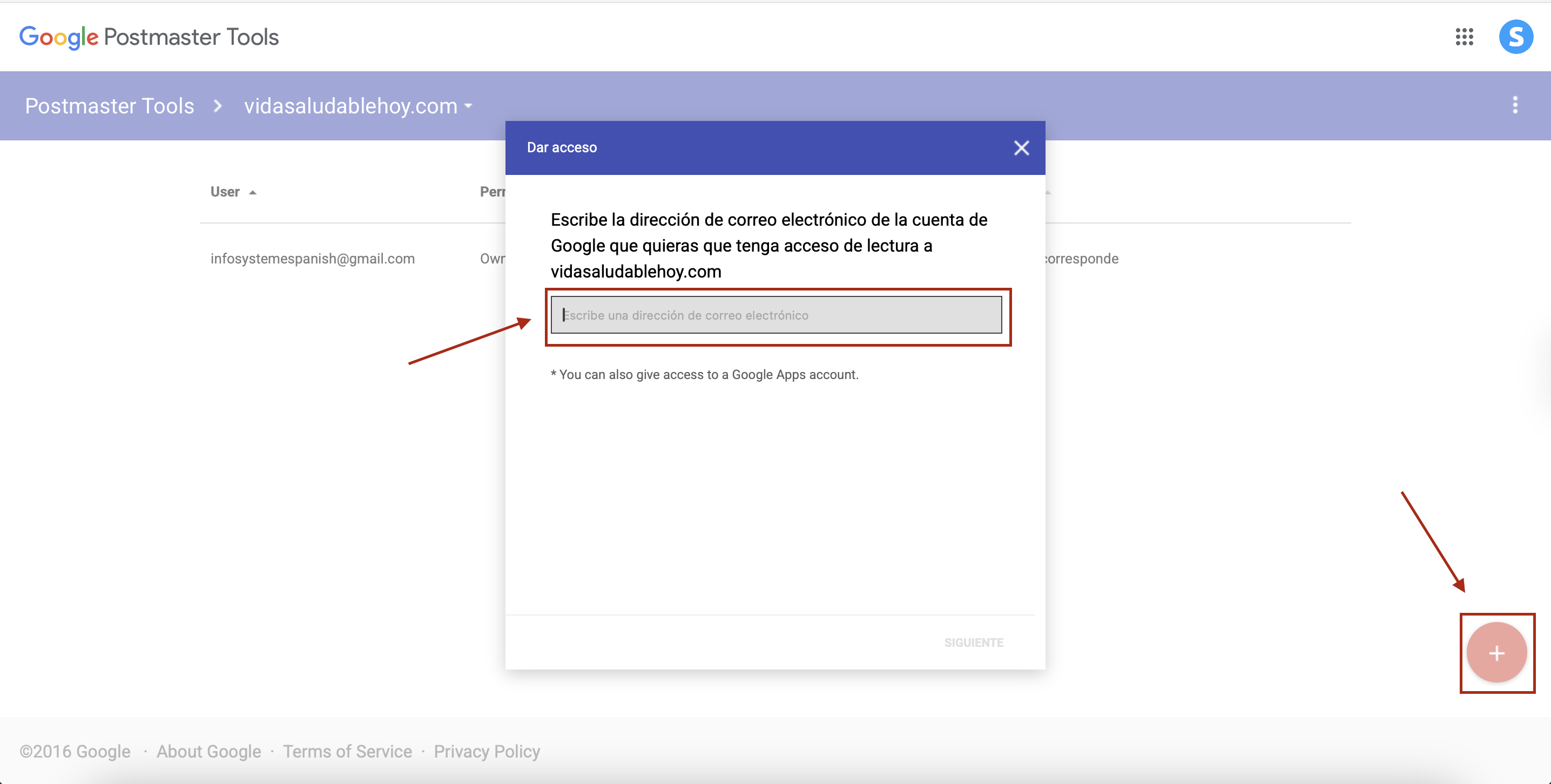 Puedes proporcionarle a nuestro equipo acceso a tu información de Gmail Postmaster Tools compartiendo el acceso a cada dominio, agregándonos como un usuario: