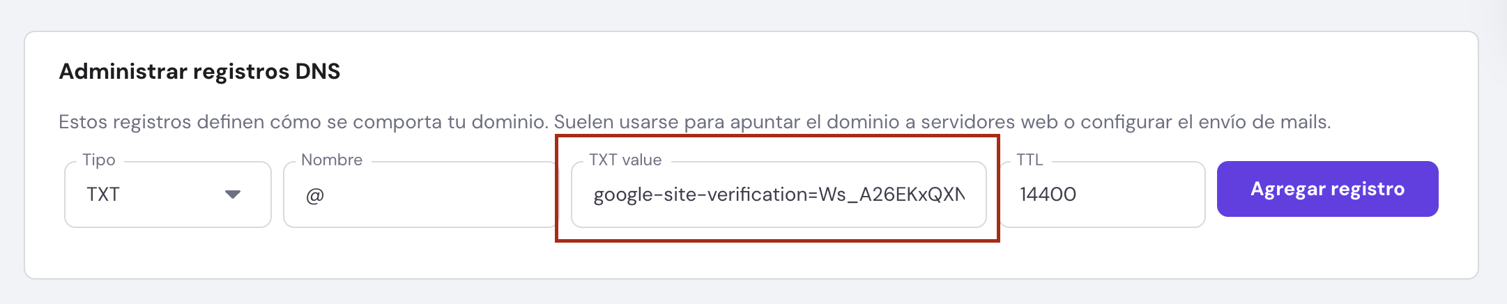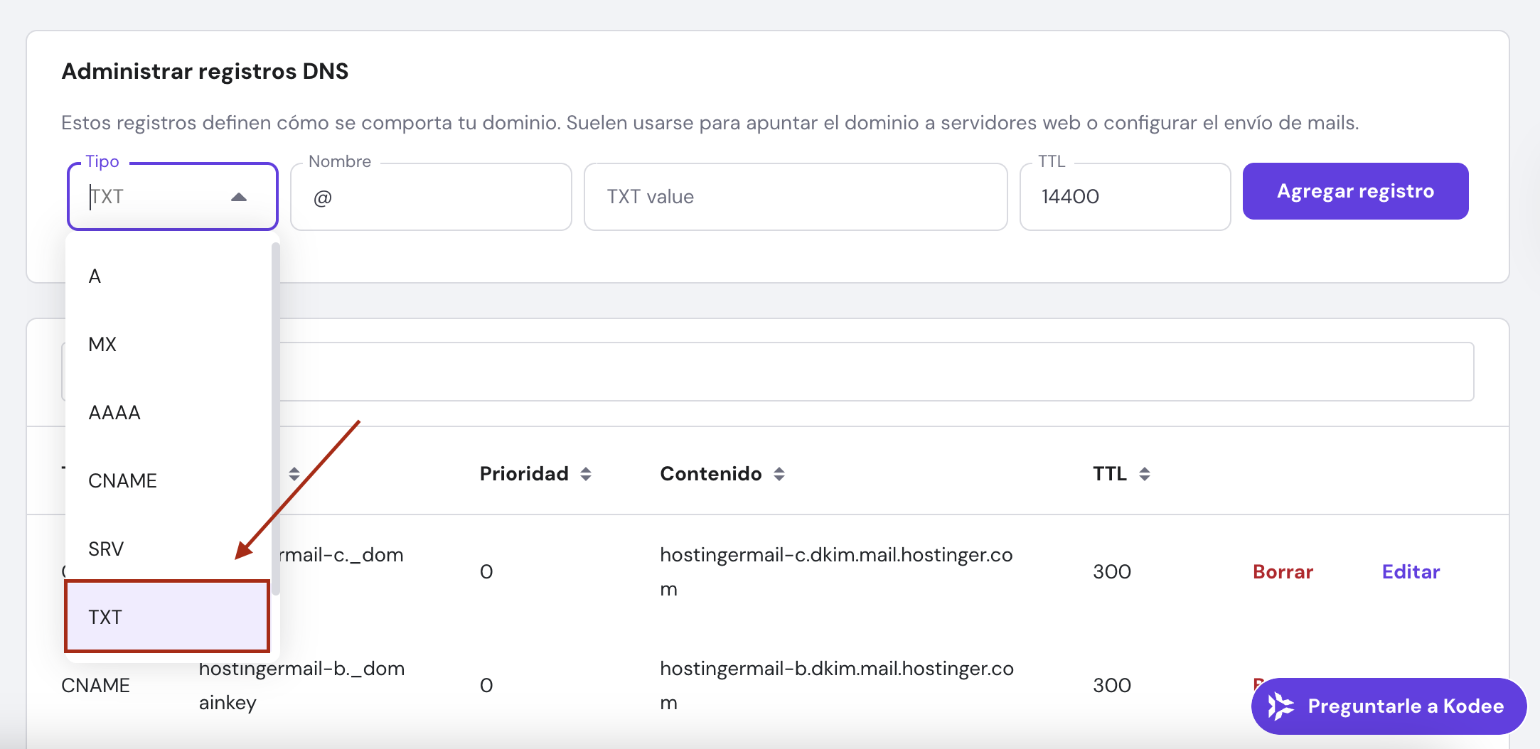 En la configuración de tu proveedor de hosting, dirígete a la sección Administrar registros DNS y selecciona el tipo de registro TXT en el menú desplegable.
