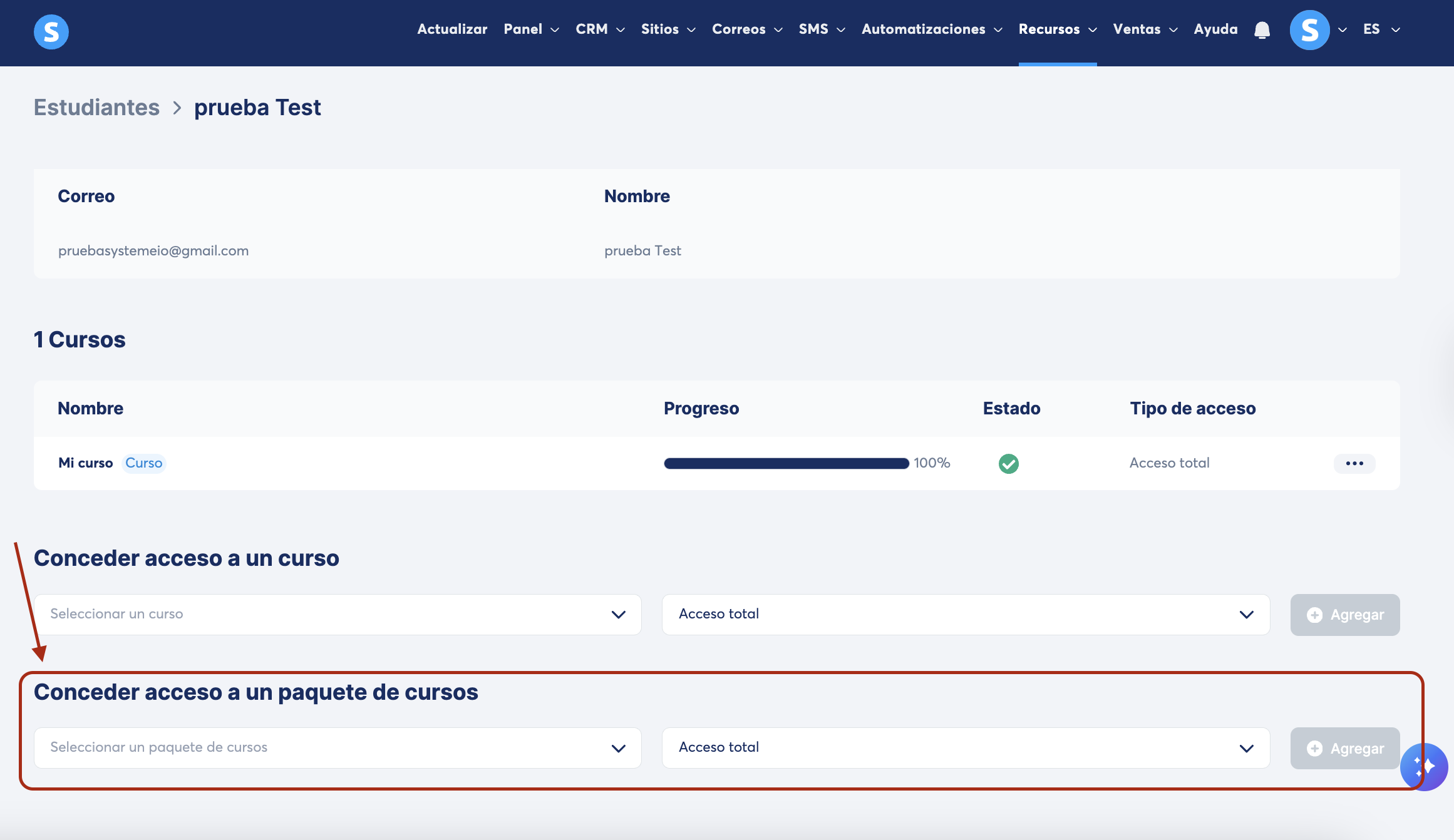 En la página de perfil del estudiante, desplázate a la sección Conceder acceso a un paquete de cursos. Selecciona el paquete de cursos deseado y el tipo de acceso. Haz clic en Agregar para otorgar acceso al estudiante.