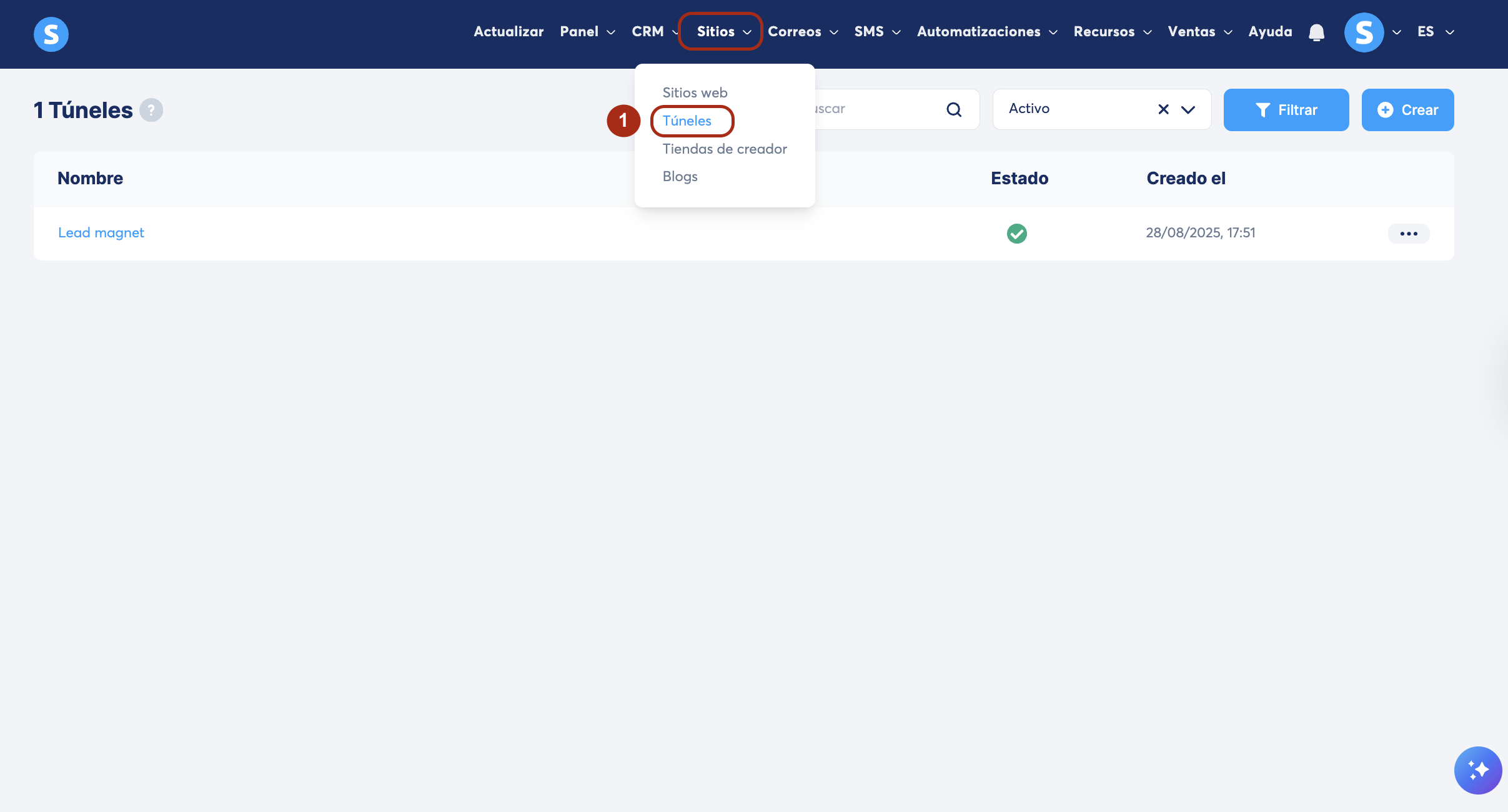 Desde el menú, haz clic en Sitios y luego en Túneles (1).