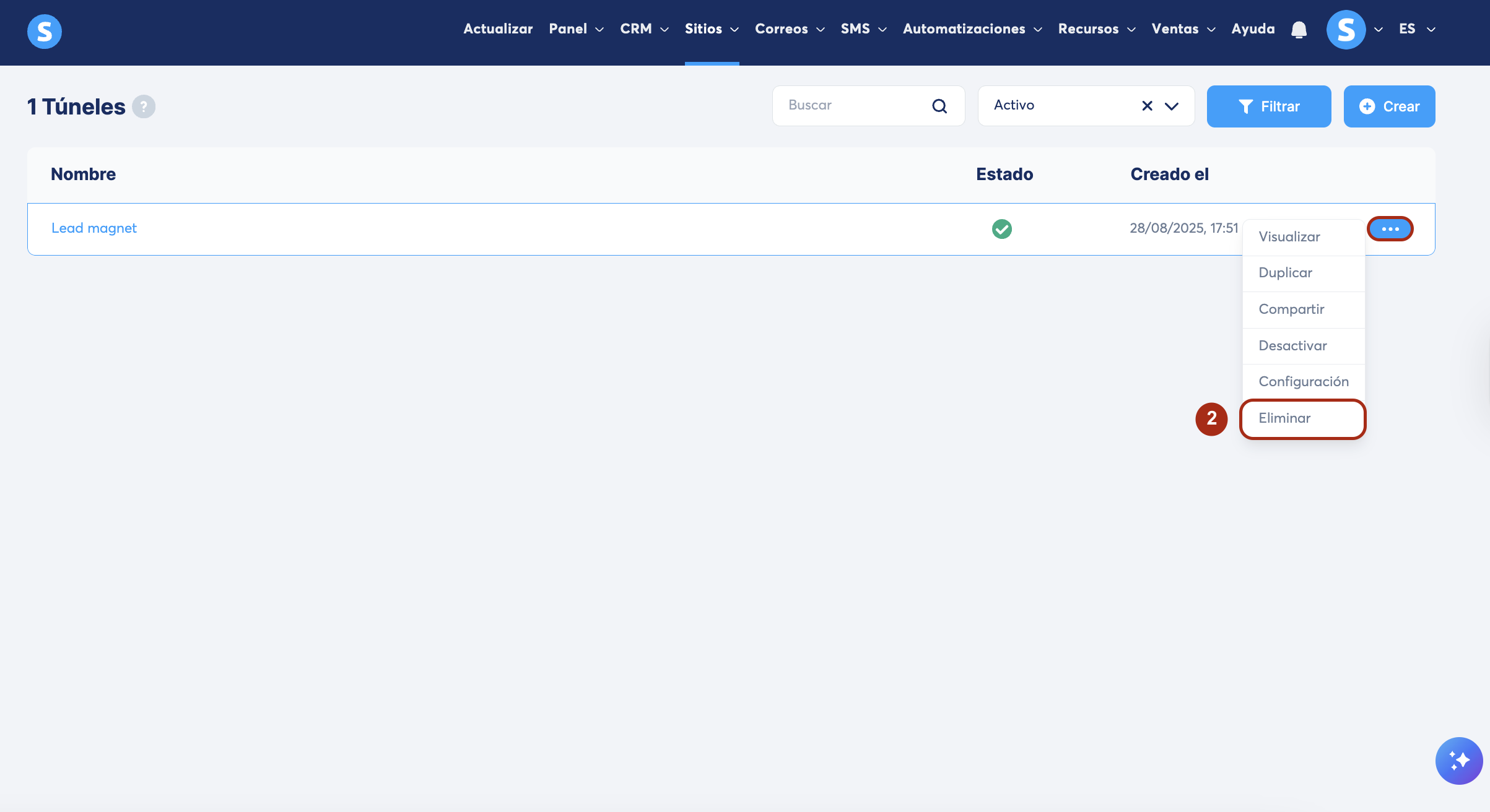 Frente el túnel que quieres eliminar, haz clic en el ícono de los tres puntos (...) y selecciona Eliminar (2).