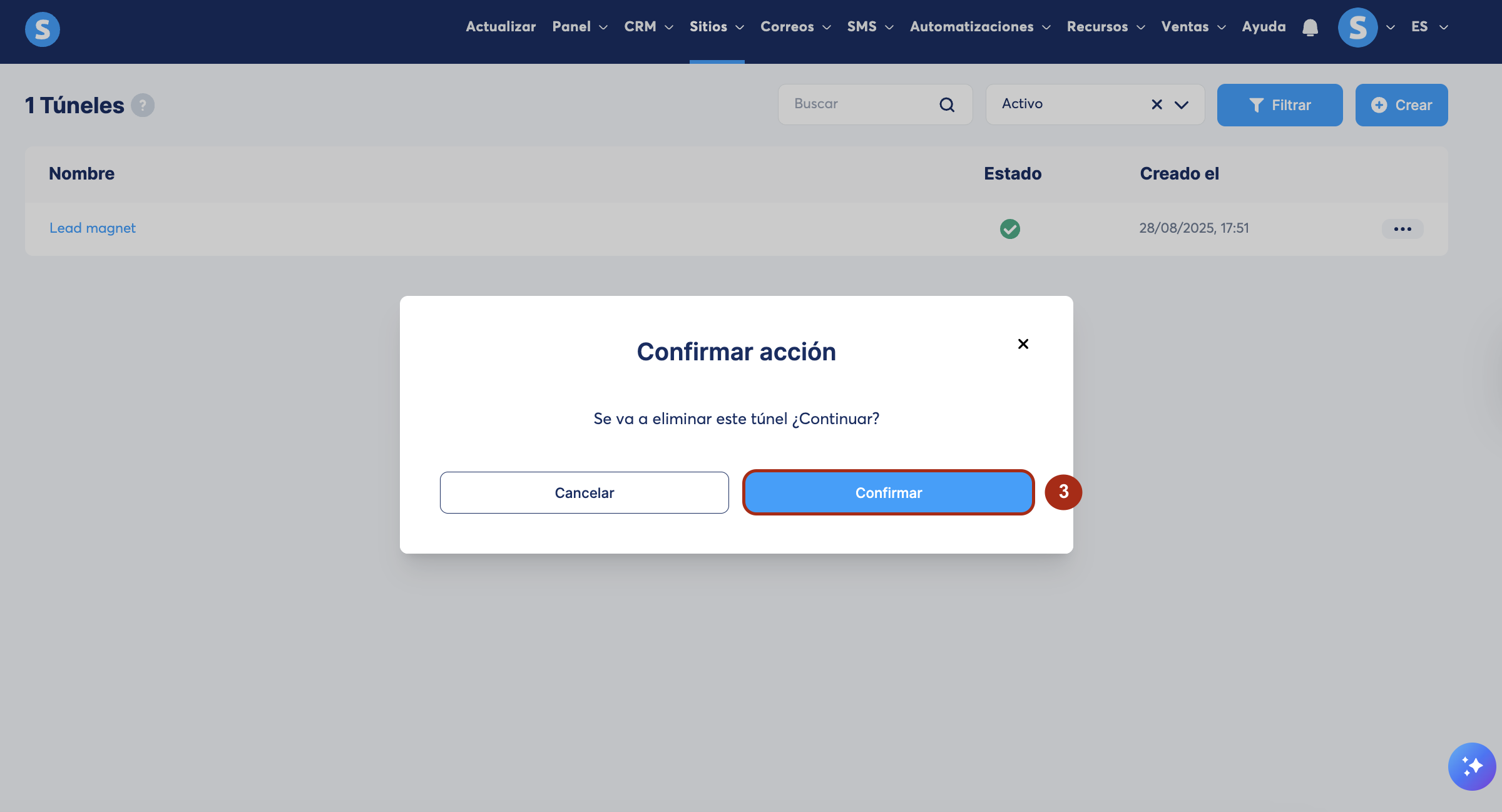 Haz clic en Confirmar para eliminar el túnel de forma permanente (3).