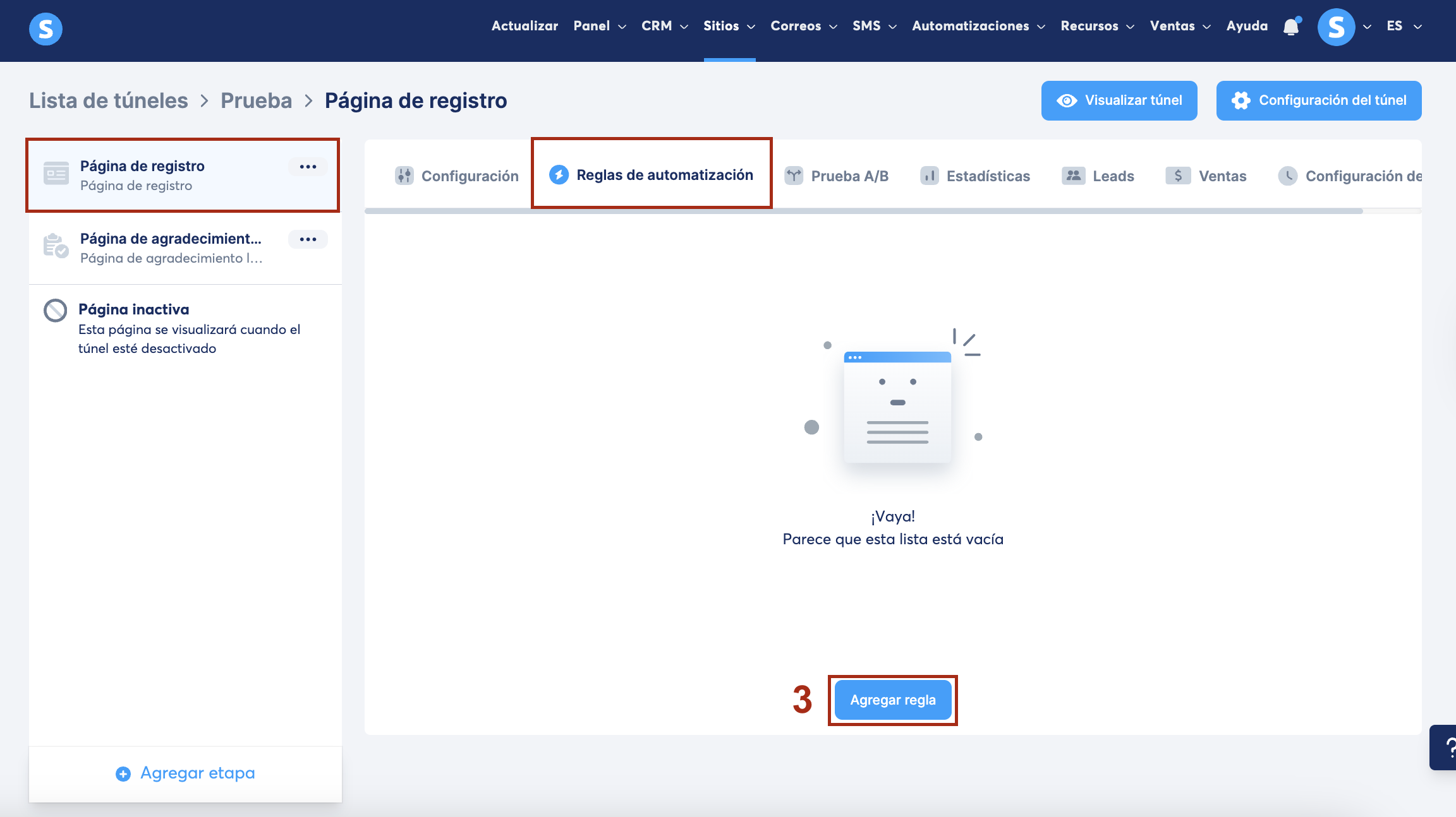- Cierra el editor y abre la pestaña Reglas de automatización en la misma página. Haz clic en el botón Agregar regla (3).