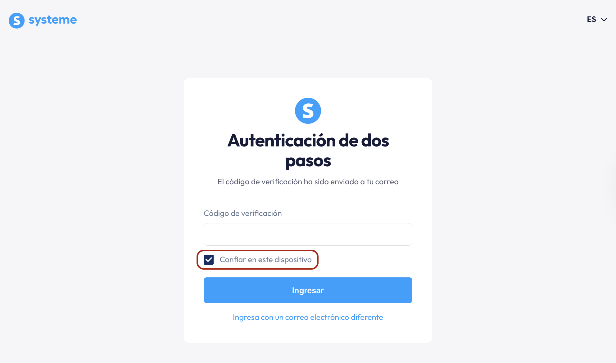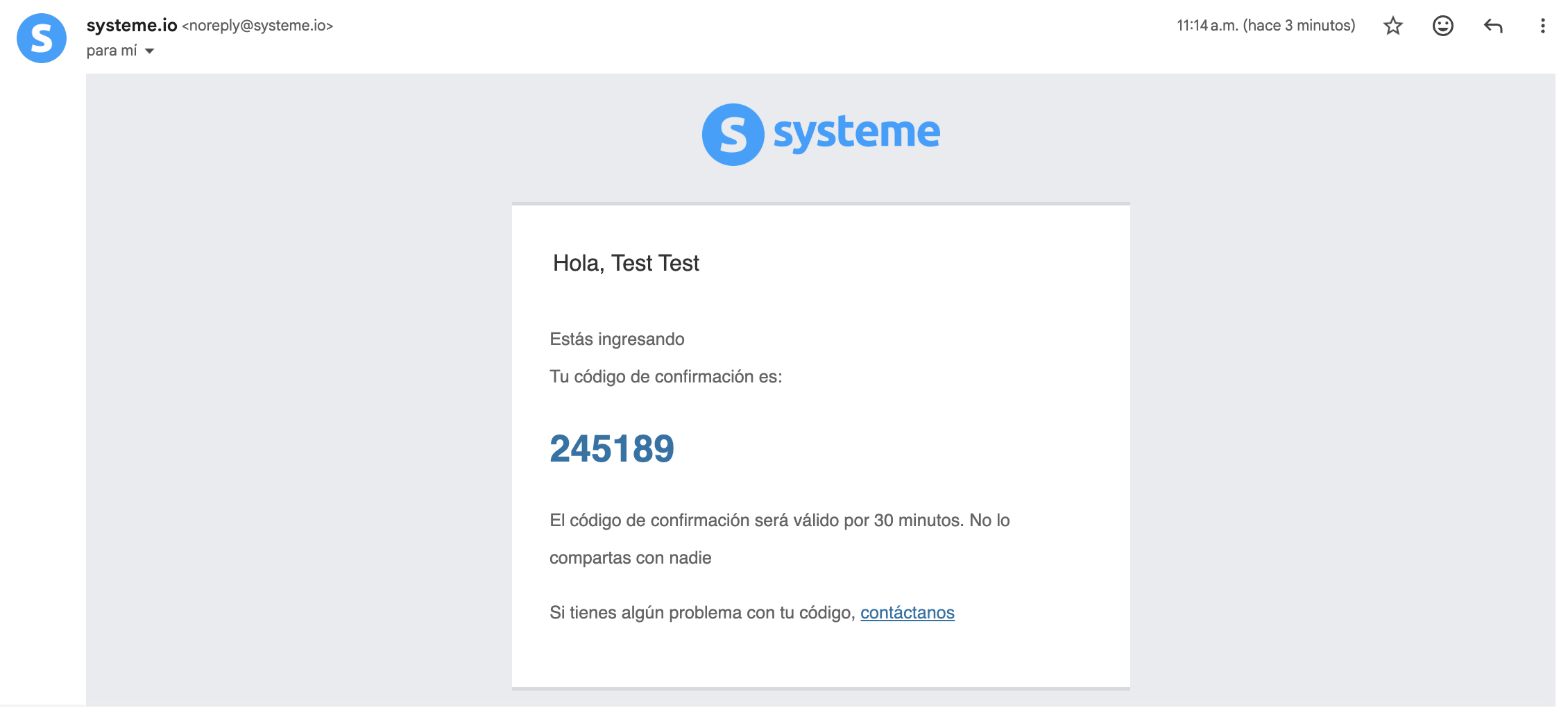 Este método requiere una segunda forma de identificación, la cual es un código enviado a tu correo electrónico cuando inicias sesión en tu cuenta de systeme.io.