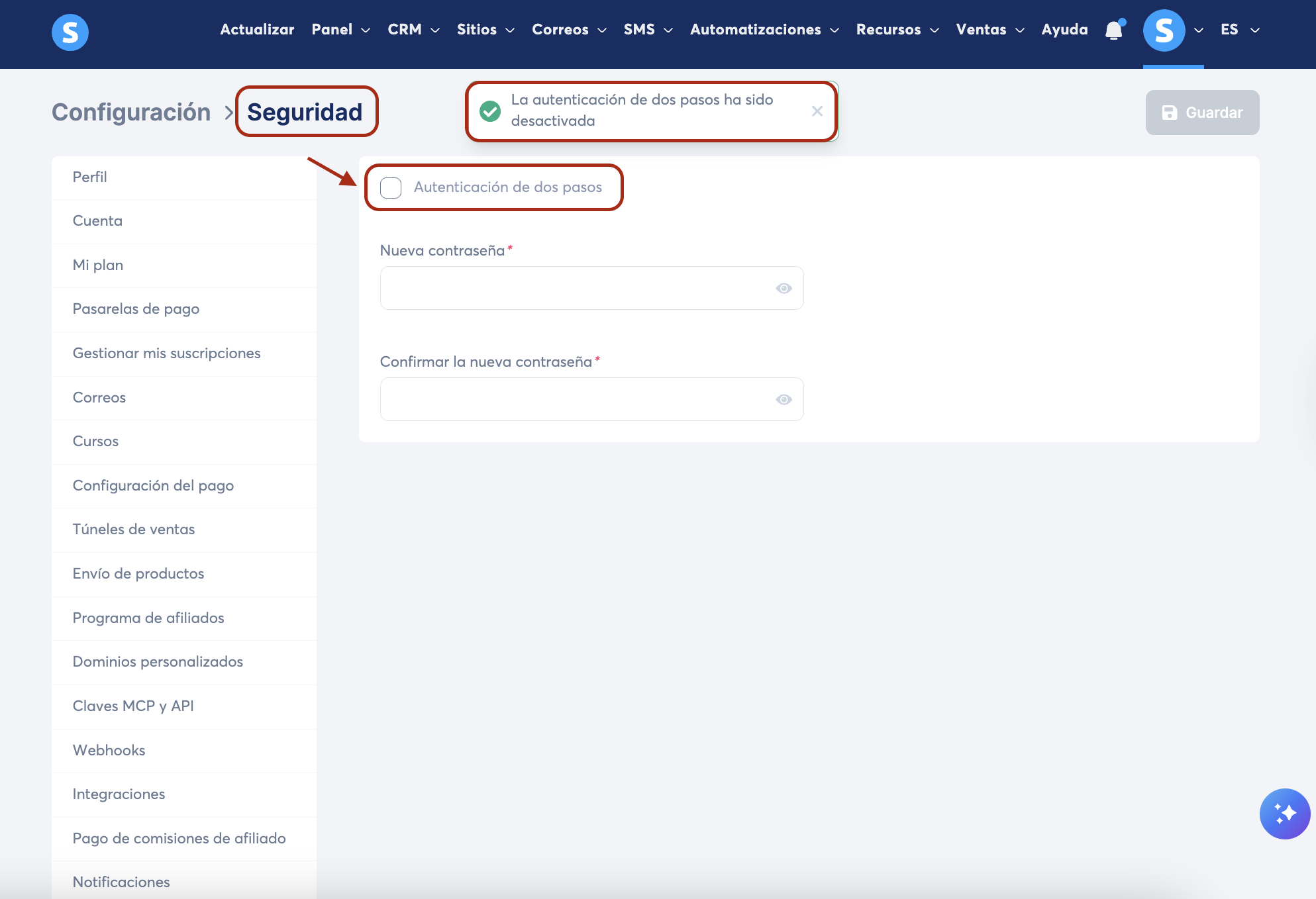 Para deshabilitar la 2FA, ve a Configuración > Seguridad y desactiva la casilla de autenticación de dos pasos.
