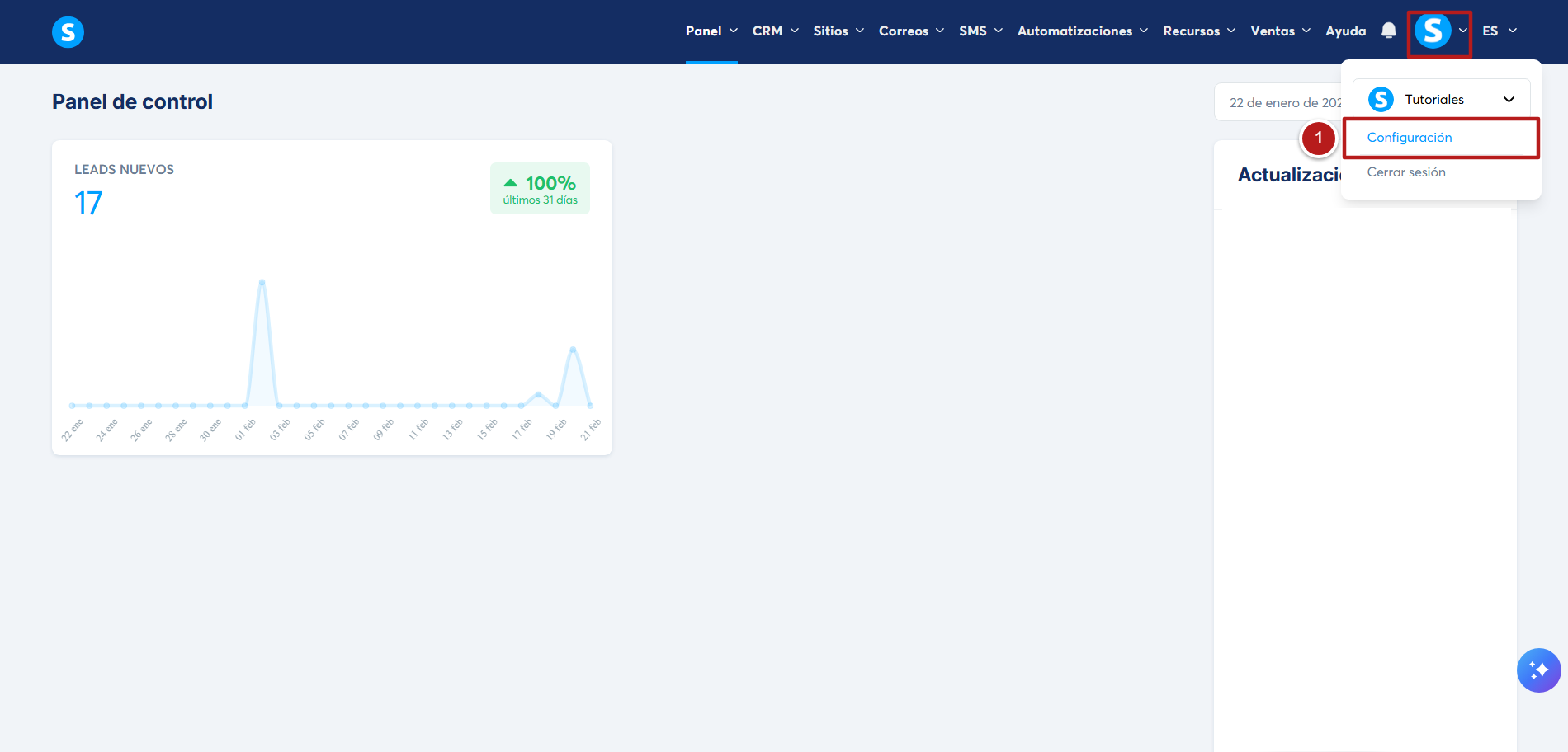 En tu cuenta de systeme.io, dirígete a tu "foto de perfil " y haz clic en "Configuración" (número 1).