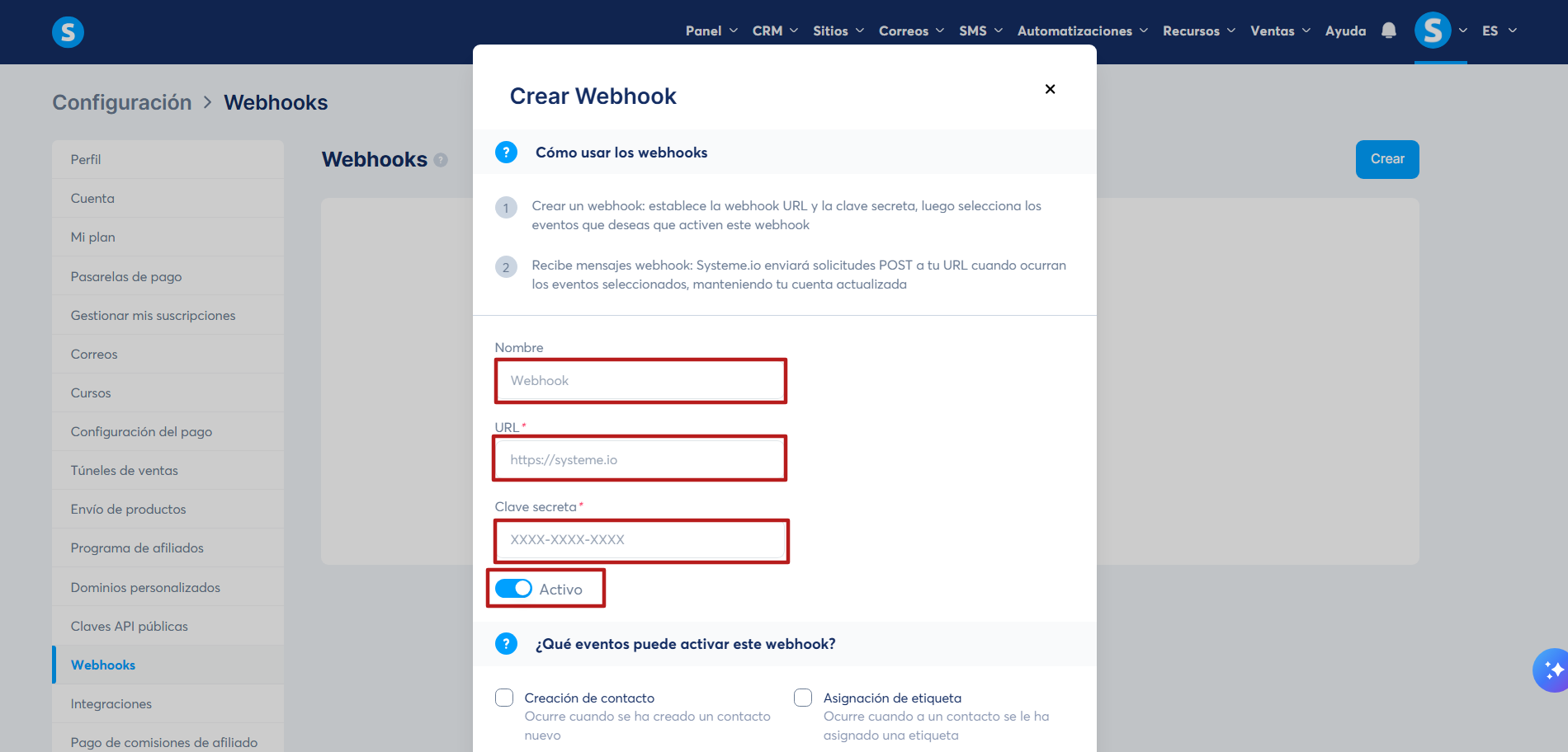 Configurar un webhook en systeme.io: