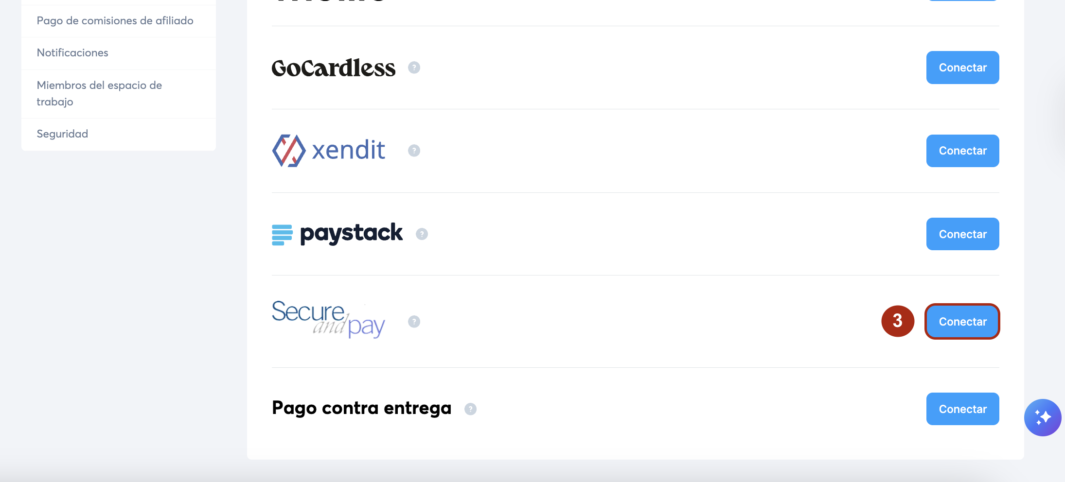 En la página de las pasarelas de pago, haz clic en Conectar (3) en la opción de Secure and pay.