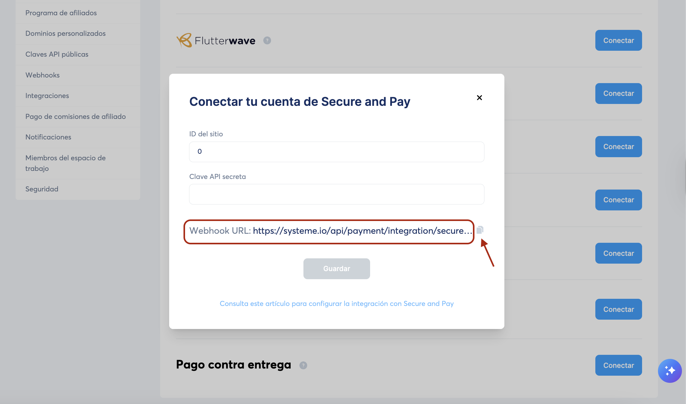 Aparecerá una ventana emergente con un webhook URL autogenerado. Debes copiar esta URL y enviarla al soporte de Secure and Pay usando este formulario de contacto, para que puedan brindarte la información que puedes usar para iniciar sesión en tu cuenta de Secure and Pay e integrar tu cuenta de Secure and Pay con systeme.io.