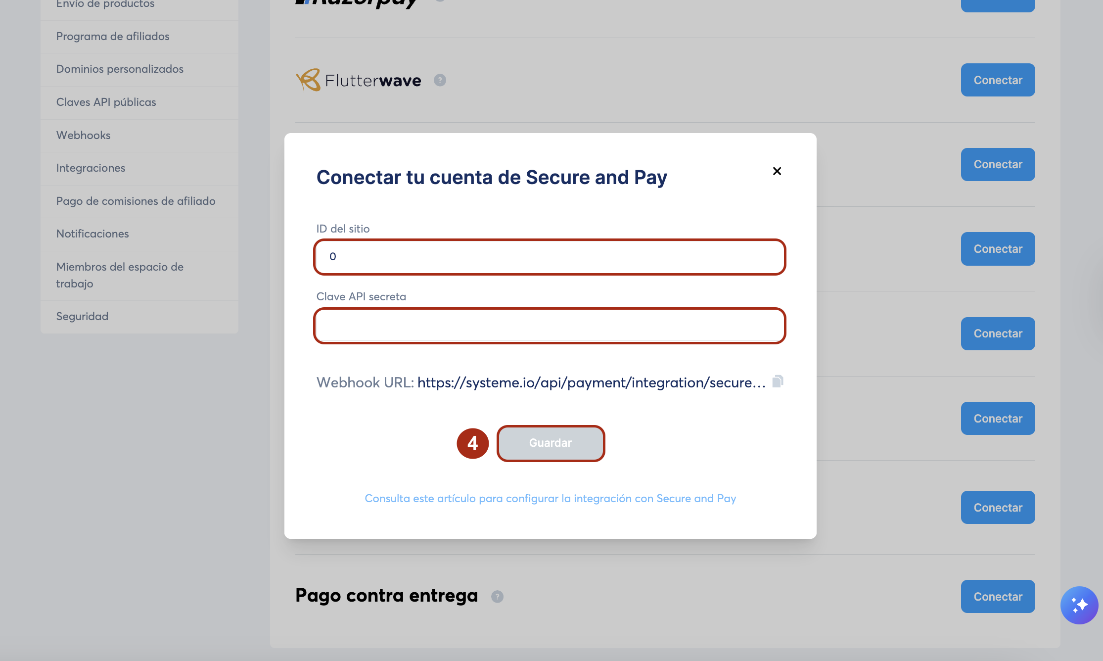 Regresa a systeme.io e ingresa en la ventana emergente de configuración el ID del sitio y la clave API secreta que recibiste en el correo del soporte de Secure and Pay, y luego haz clic en Guardar (4) para finalizar la integración .