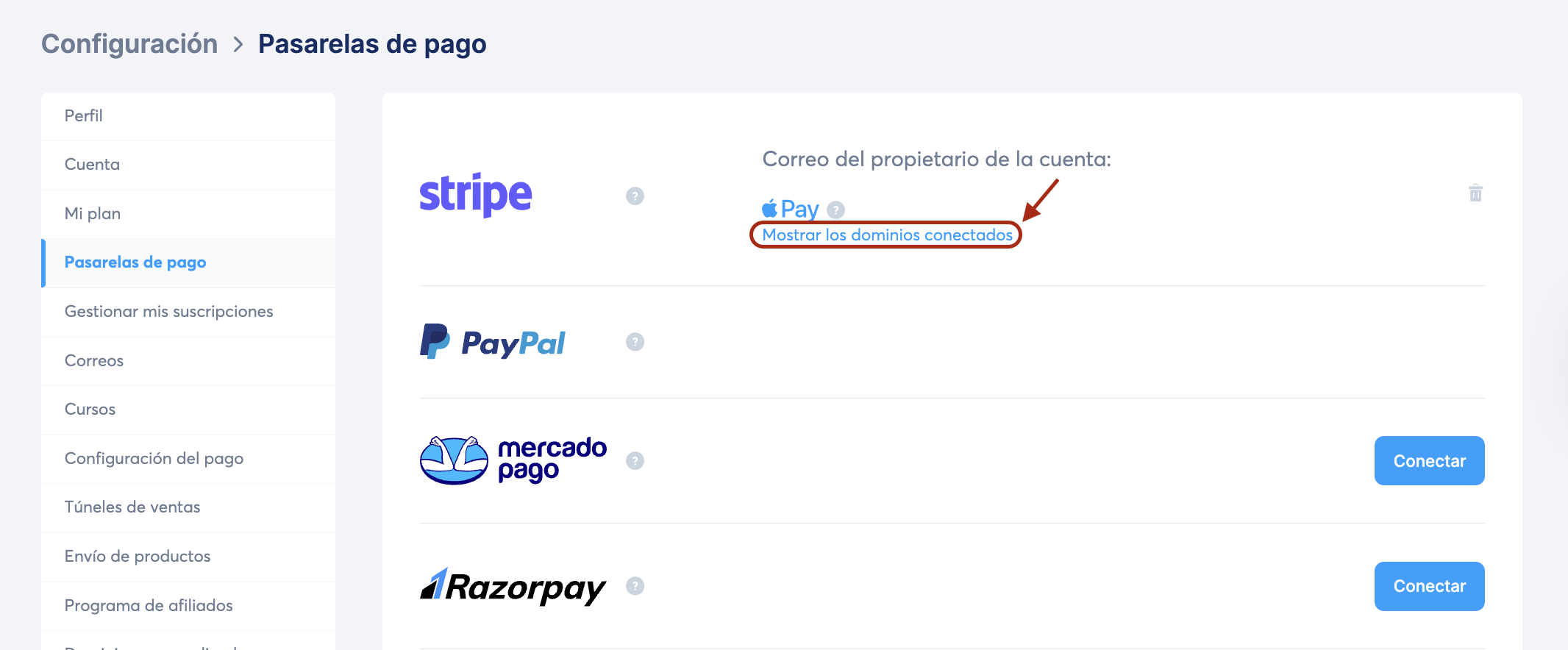 - Después de que tu dominio esté validado, ve a la pasarelas de pago de Stripe y haz clic en Apple Pay.