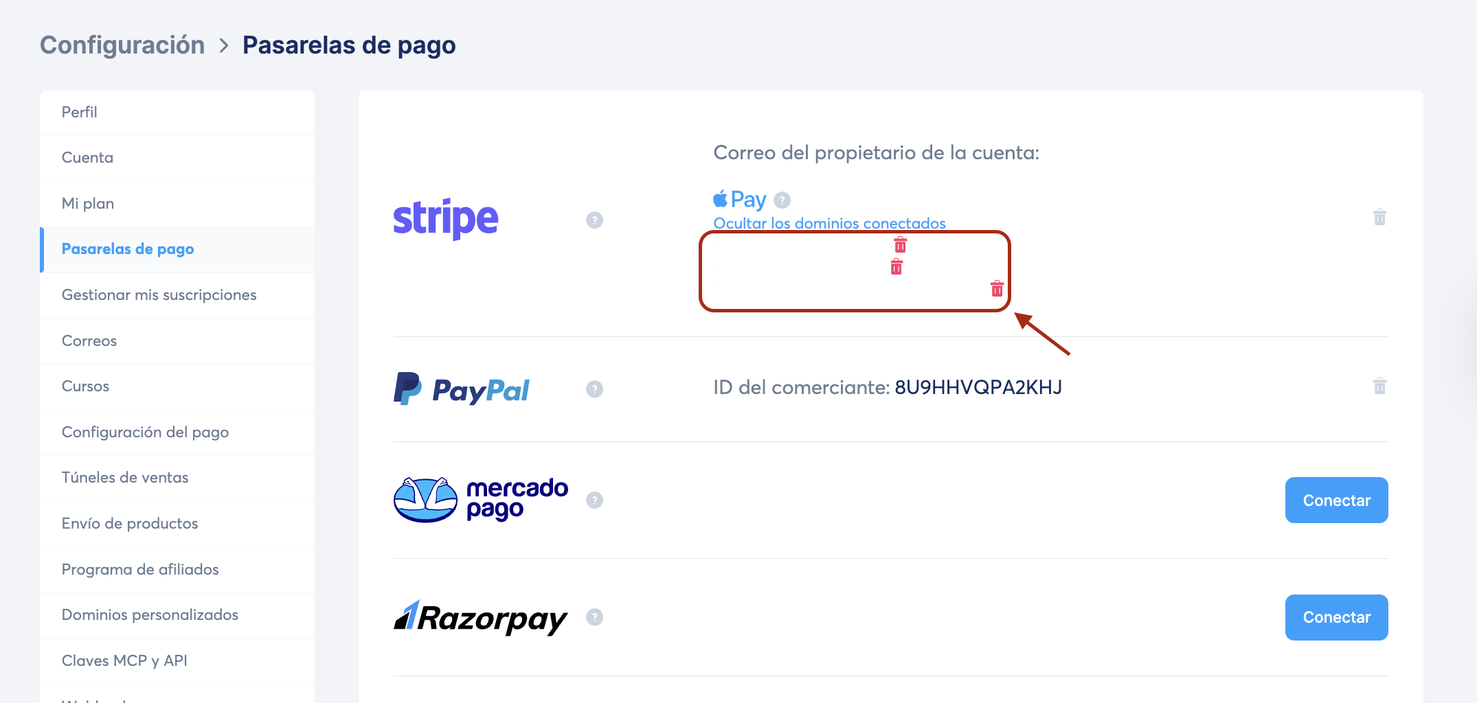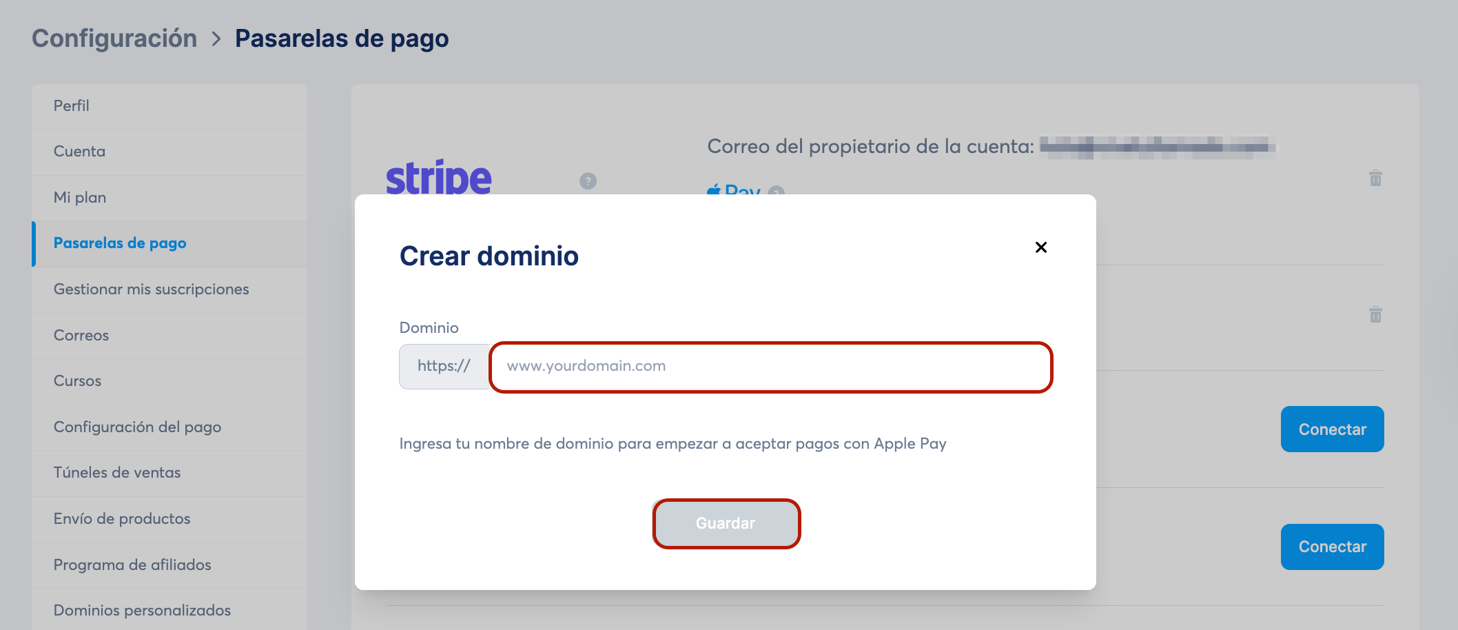Si deseas agregar un nuevo dominio para Apple Pay después de conectar Stripe, puedes hacerlo manualmente: