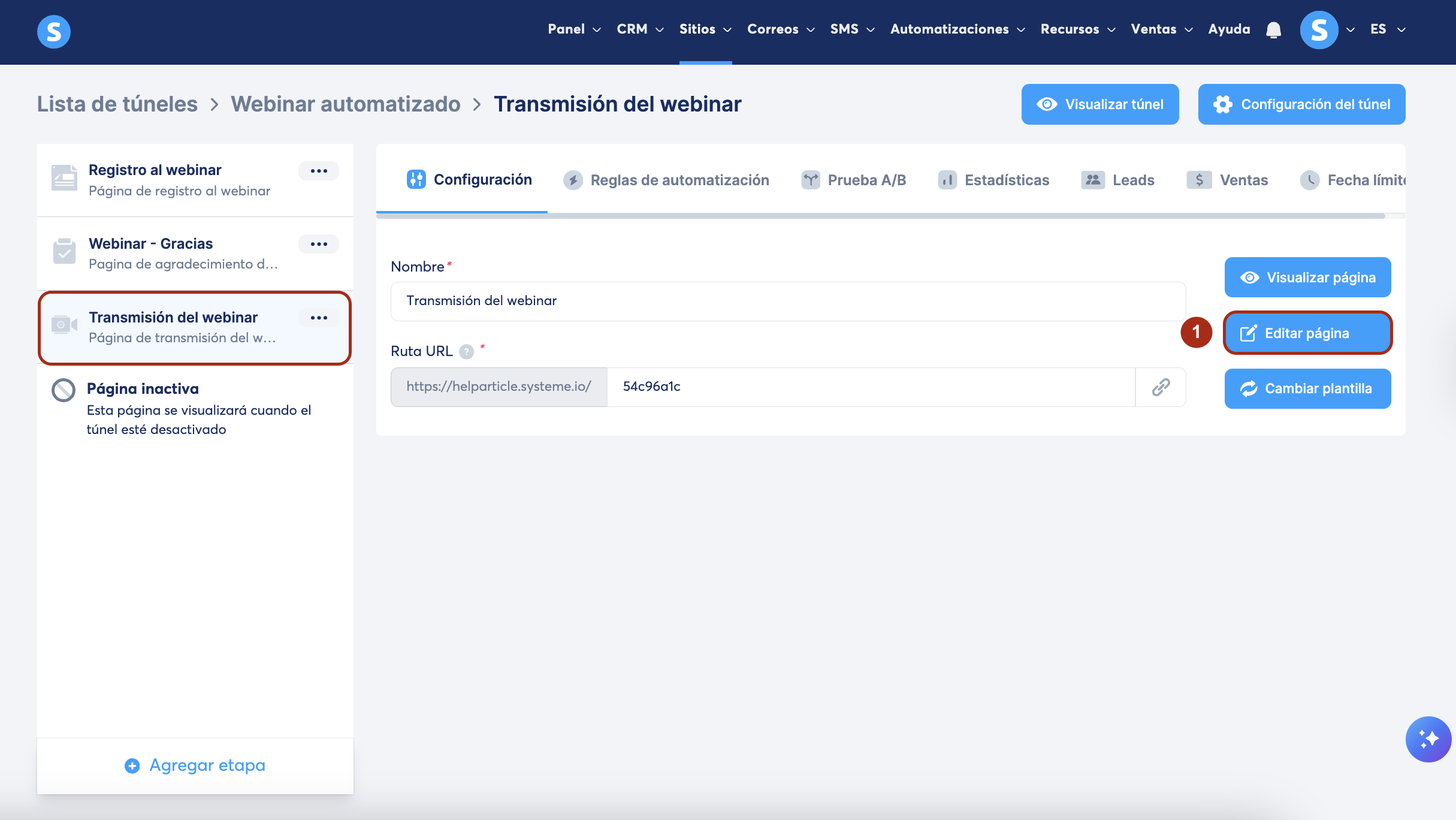 Abre el editor de página de tu página de transmisión del webinar (1).