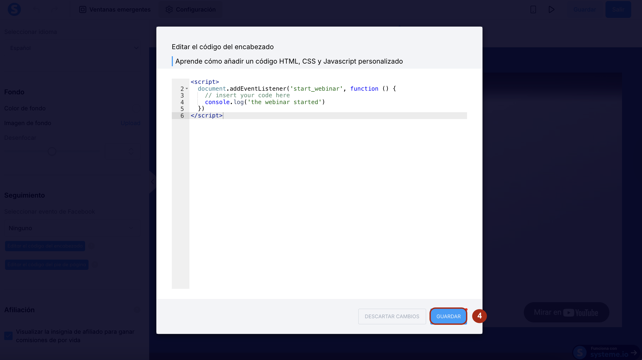 Cómo activar un código personalizado en el evento "webinar iniciado"