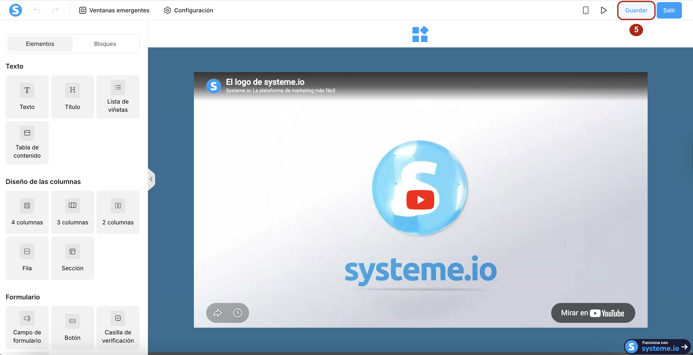 Después de confirmar que el generador funciona, regresa al editor de página y y haz clic en Guardar (5) para guardar los cambios. Una vez los cambios sean aplicados, la anterior versión de la página no podrá ser restaurada.