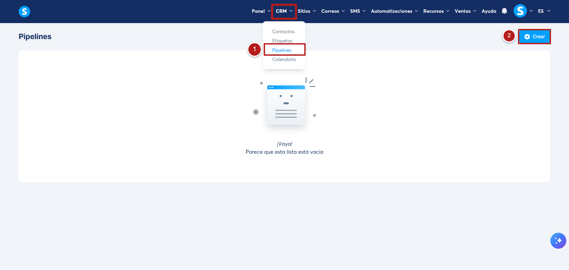 Para crear un pipeline en systeme.io, dirígete a la pestaña "CRM" del menú de la cuenta y haz clic en la sección "Pipeline" (número 1)
