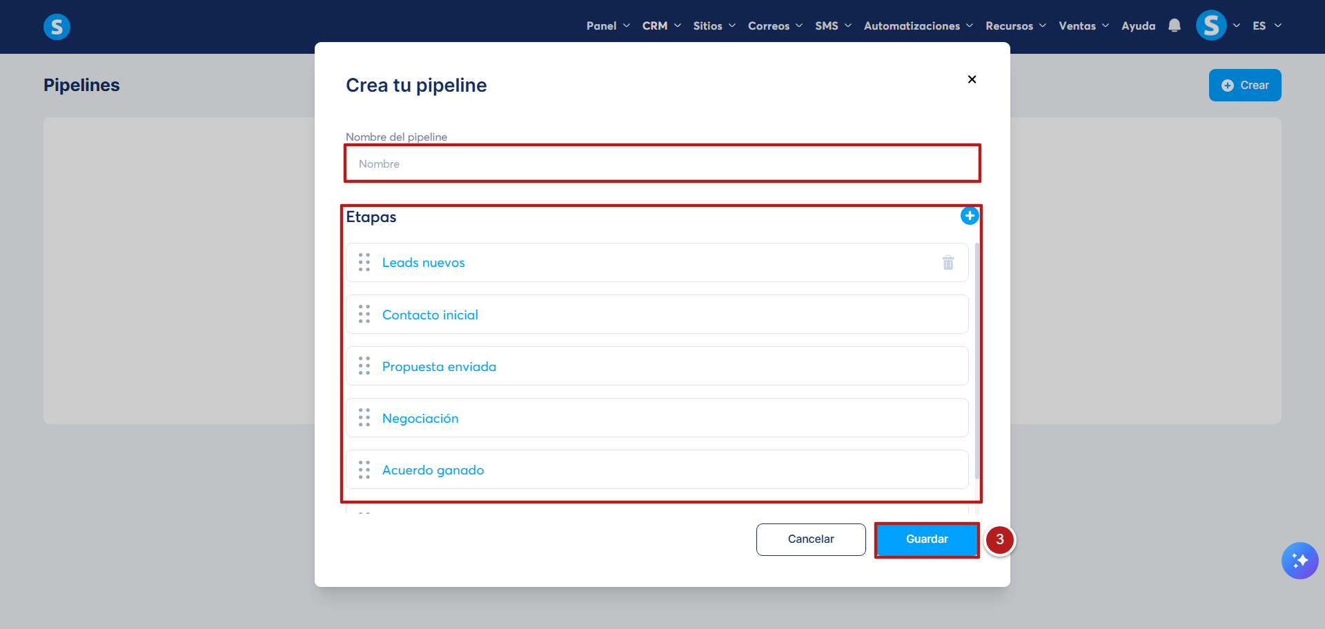 Asígnale un nombre y etapas al pipeline, luego haz clic en "Guardar" para terminar la creación del nuevo pipeline (número 2)