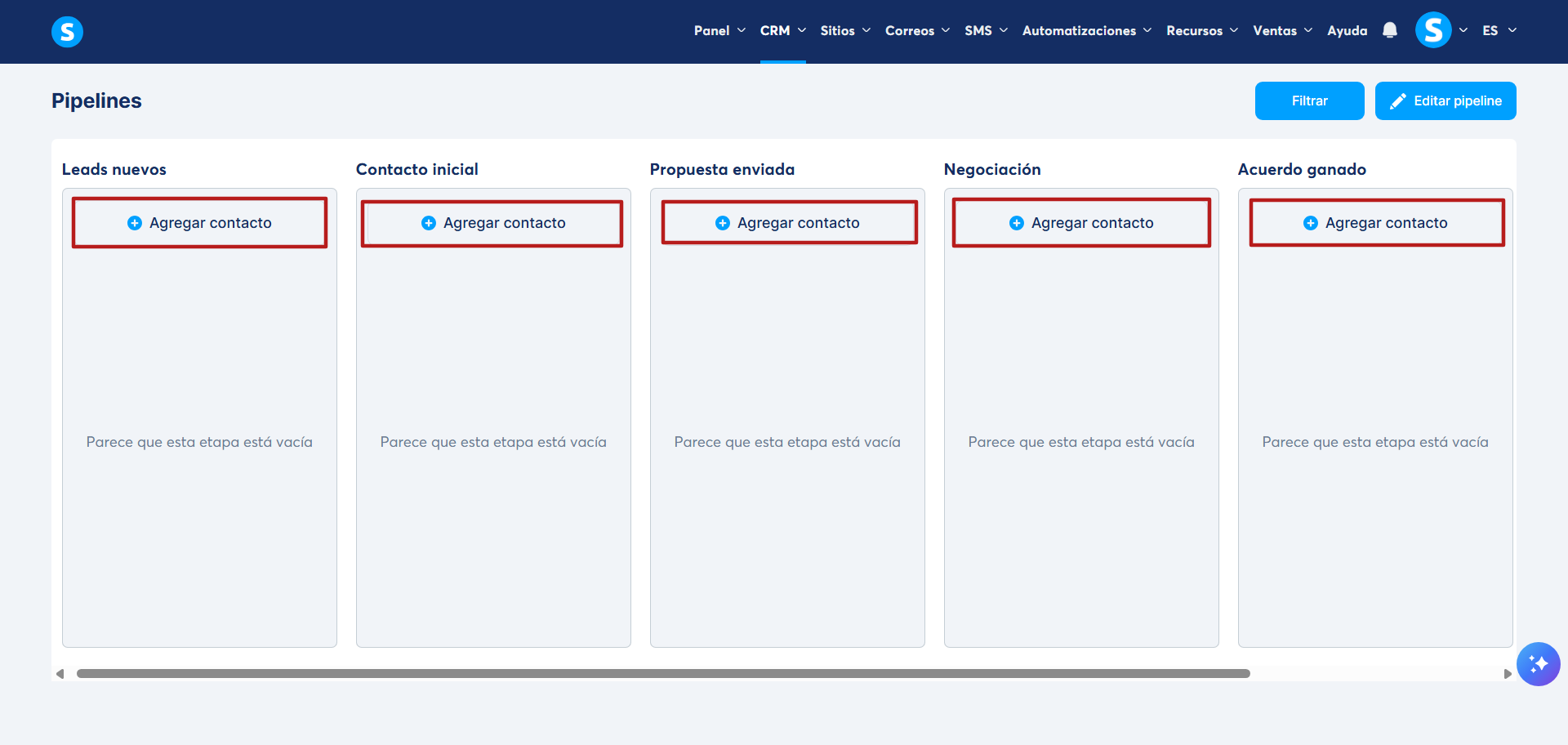 Ten en cuenta que por defecto, cuando un nuevo pipeline de ventas es creado, automáticamente es configurado con 6 etapas, las cuales pueden ser modificadas con facilidad según tus necesidades. Las etapas predeterminadas son las siguientes: