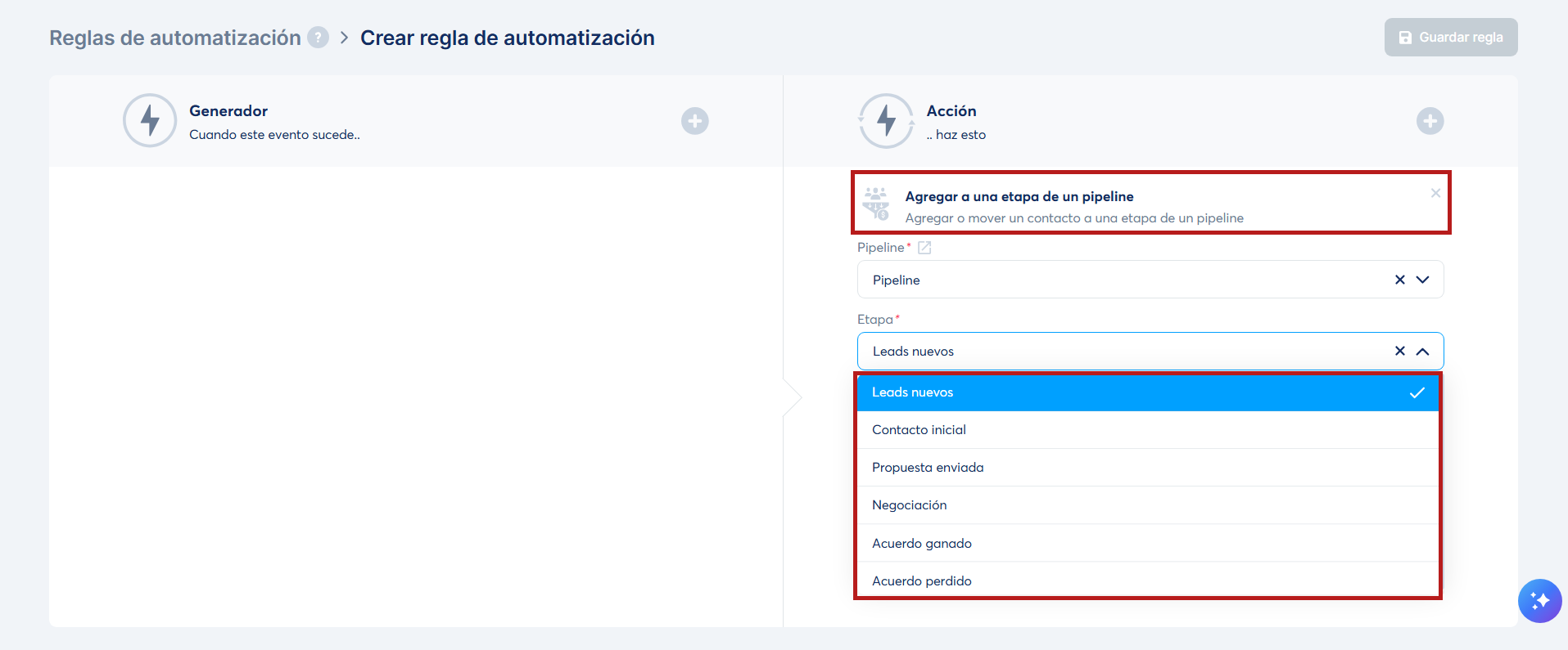 2. Automáticamente: usando una regla de automatización para agregar prospectos a una etapa específica o moverlos de una etapa a otra, agilizando y acelerando el proceso. Esto simplifica las oportunidades de gestión evitando intervenciones manuales repetitivas y asegurando que los prospectos se muevan de forma correcta a través del pipeline.