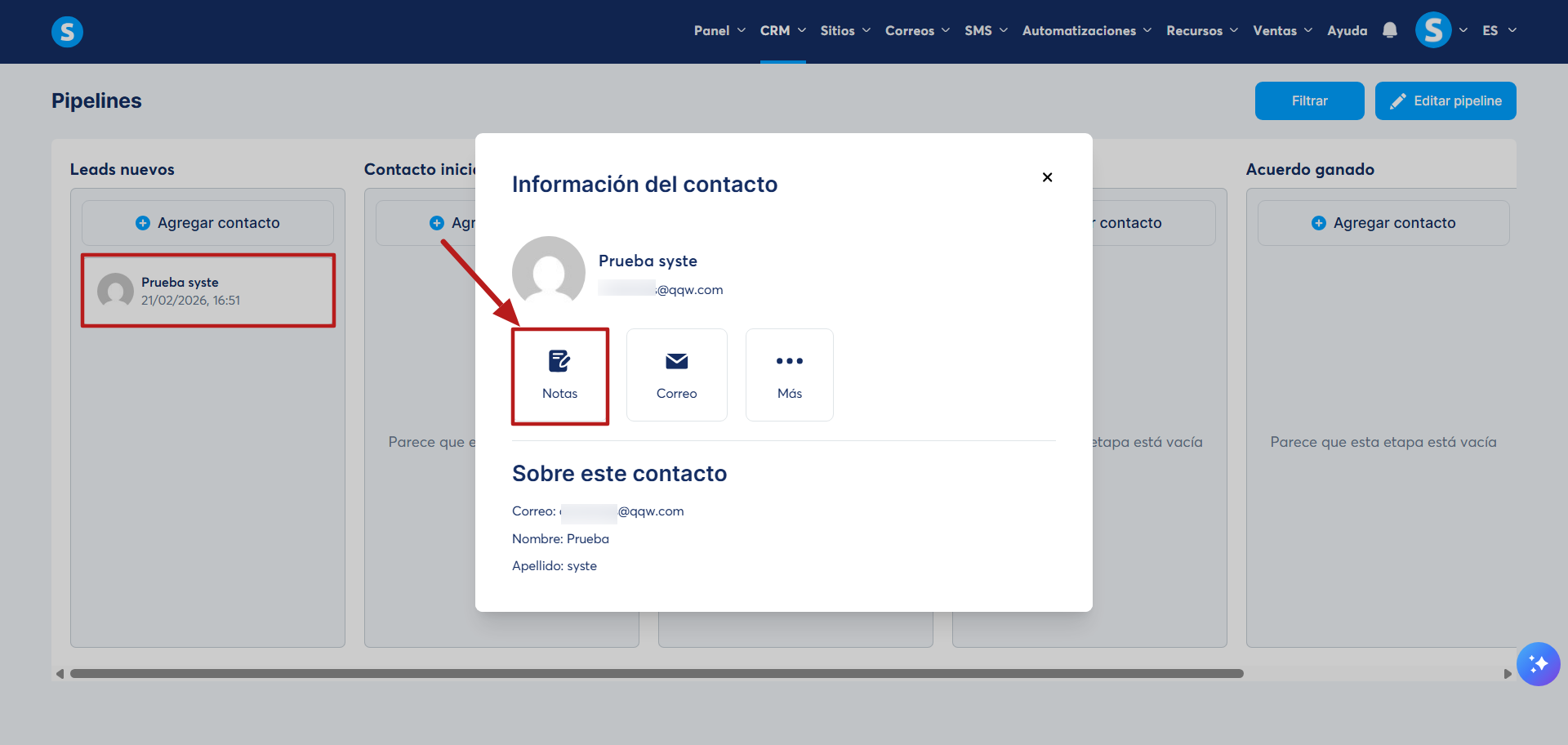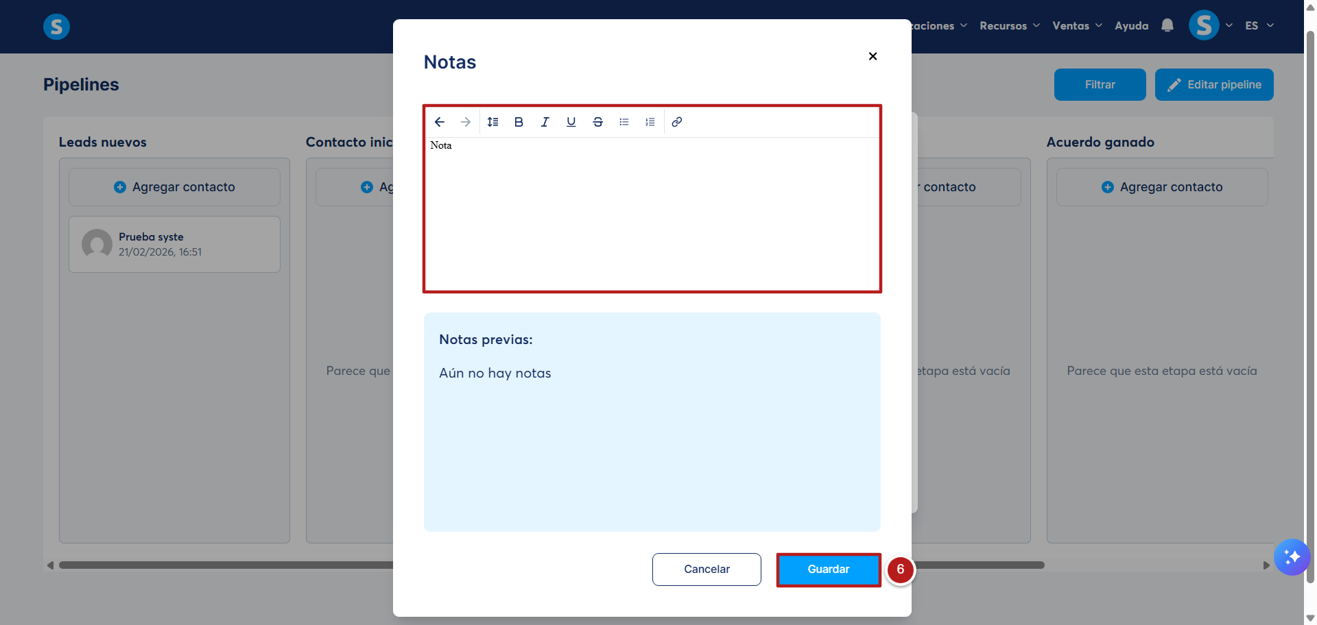 También puedes agregar notas al perfil de los contactos de tu pipeline, l o que te ayudará a registrar información importante para cada uno de los contactos del pipeline. Esto incluye detalles importantes, idea o el resumen de las llamadas que se hayan realizado, centralizando toda la información en un solo lugar para contar con una organización óptima.