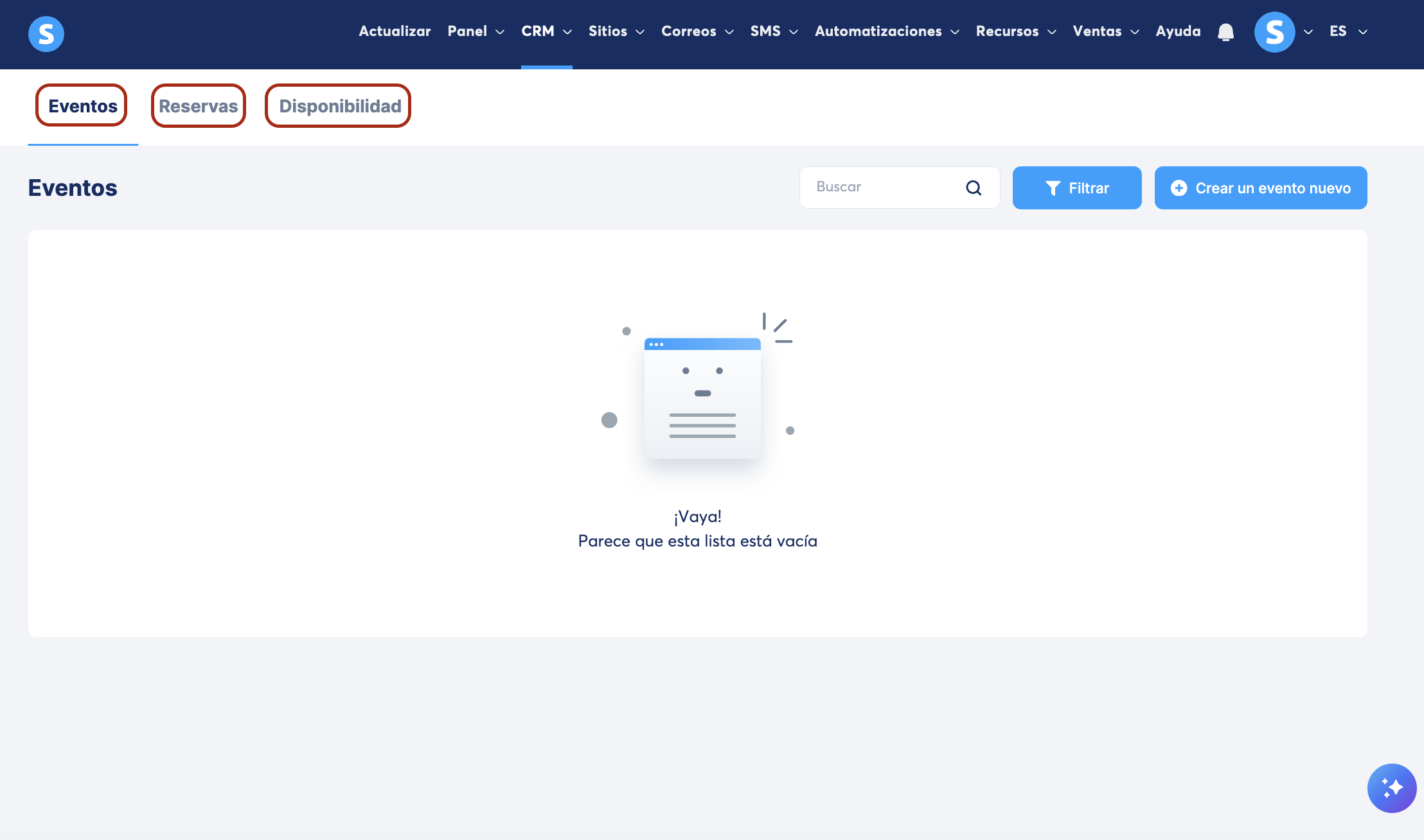Esta pestaña muestra todos los eventos que has creado. Puedes verlos y crear nuevos.