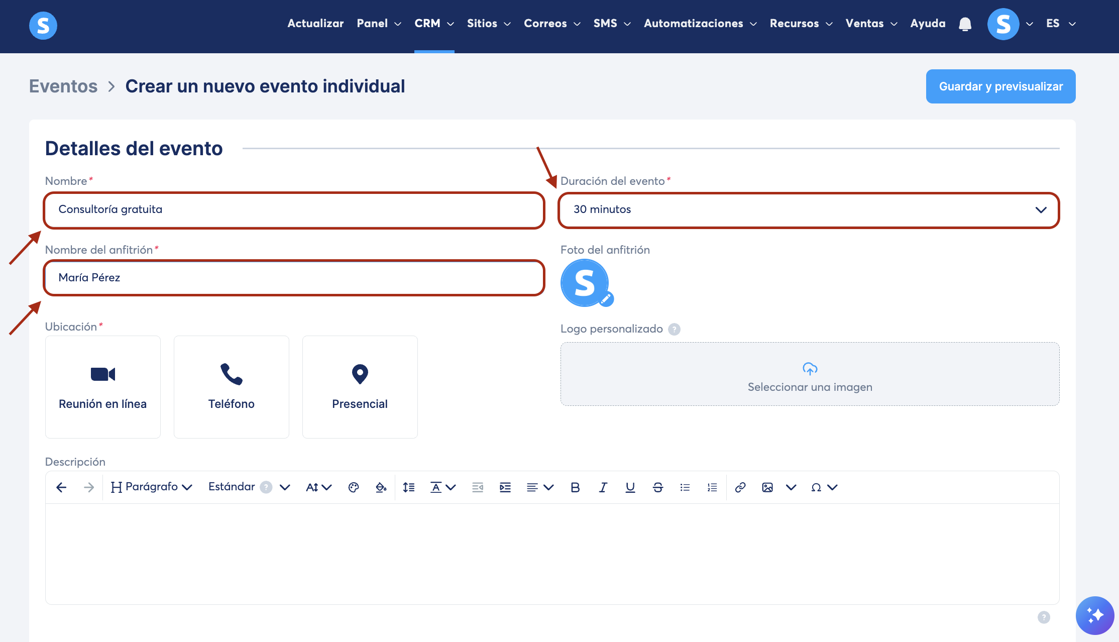 - Descripción del evento: agrega una breve descripción de tu evento. Se mostrará en la página de tu reserva.