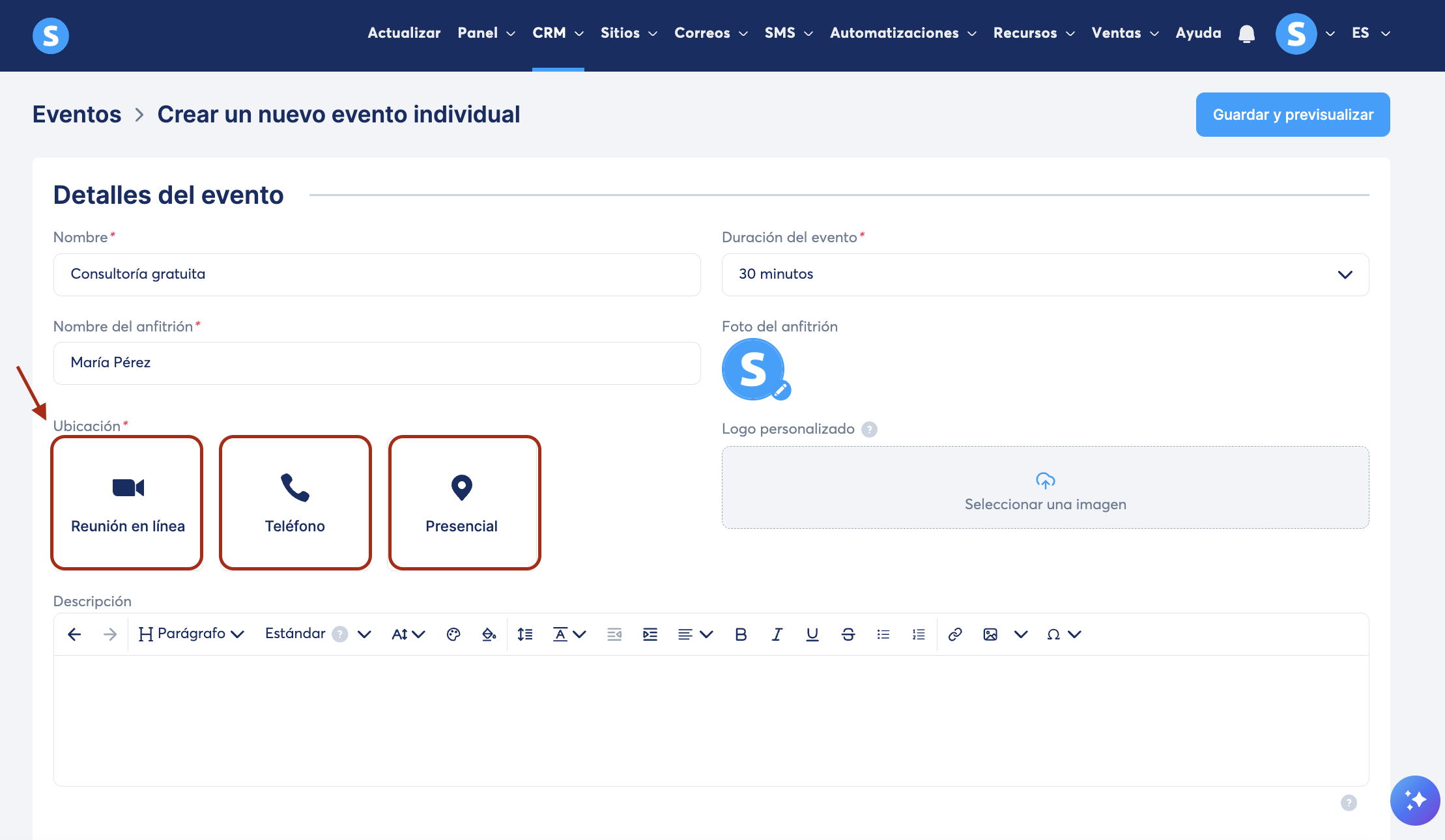 Nota: puedes ofrecer varias ubicaciones para el mismo evento (ej., llamada y presencial). El asistente puede seleccionar el método de tu preferencia.