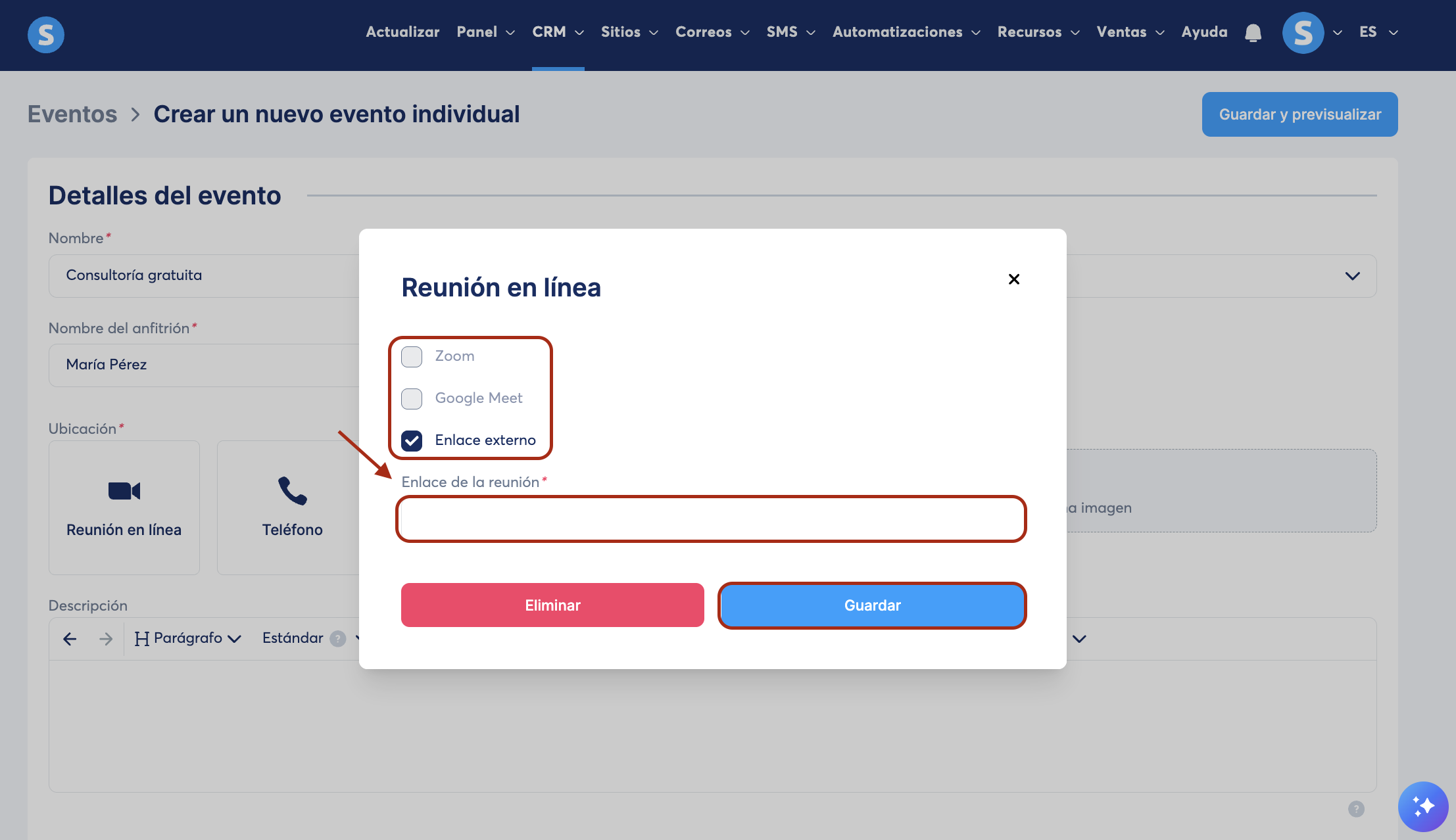 - Si estás usando Zoom o Google Meet, asegúrate de que la integración esté configurada previamente. Para una guía detallada, consulta: