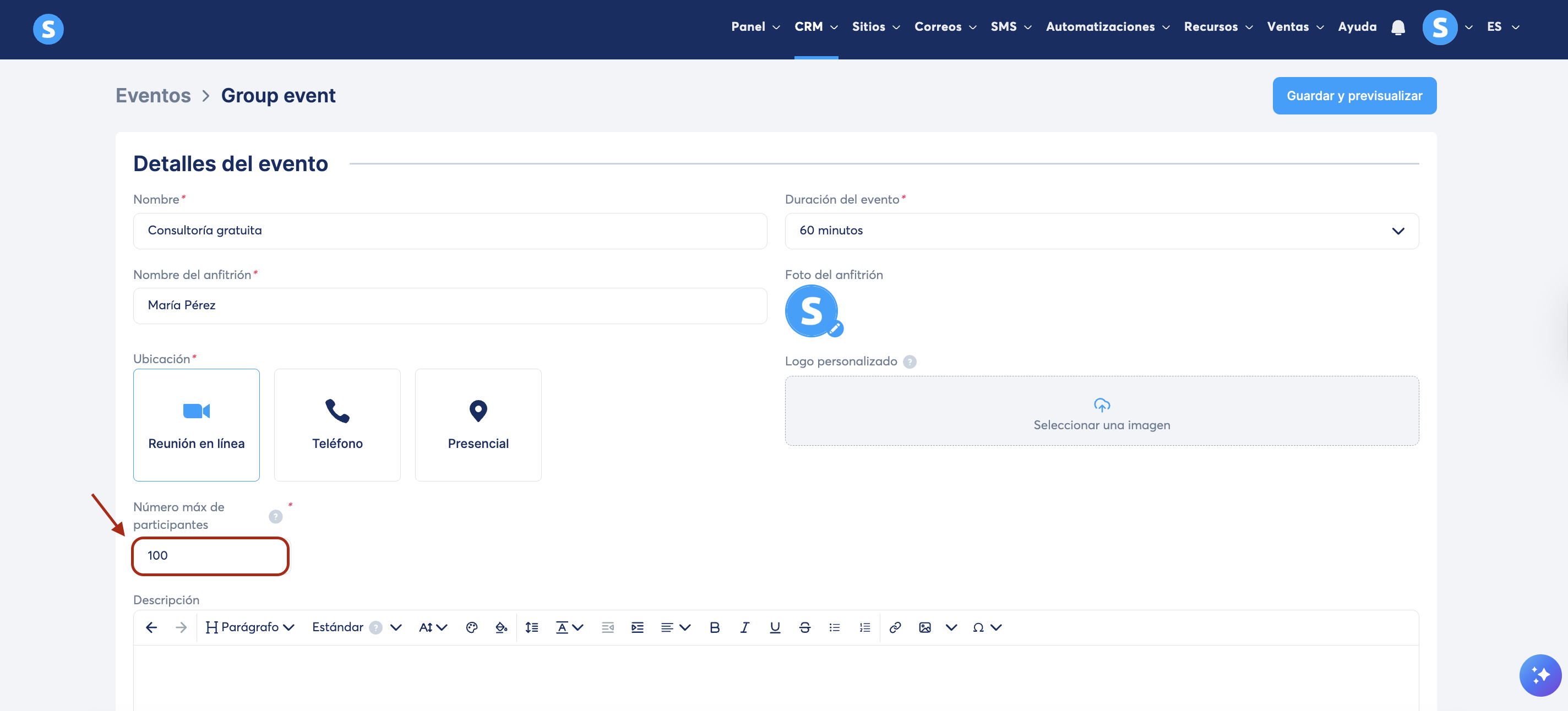 - Al crear un evento gripal, tendrás que definir el número máximo de participantes. Este número no debe exceder el límite permitido por la herramienta externa que usarás para la reunión.
