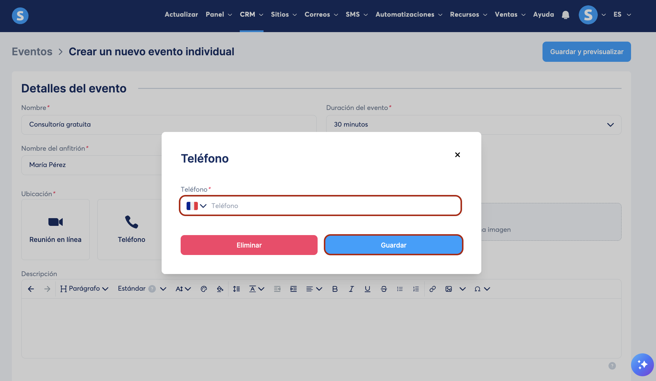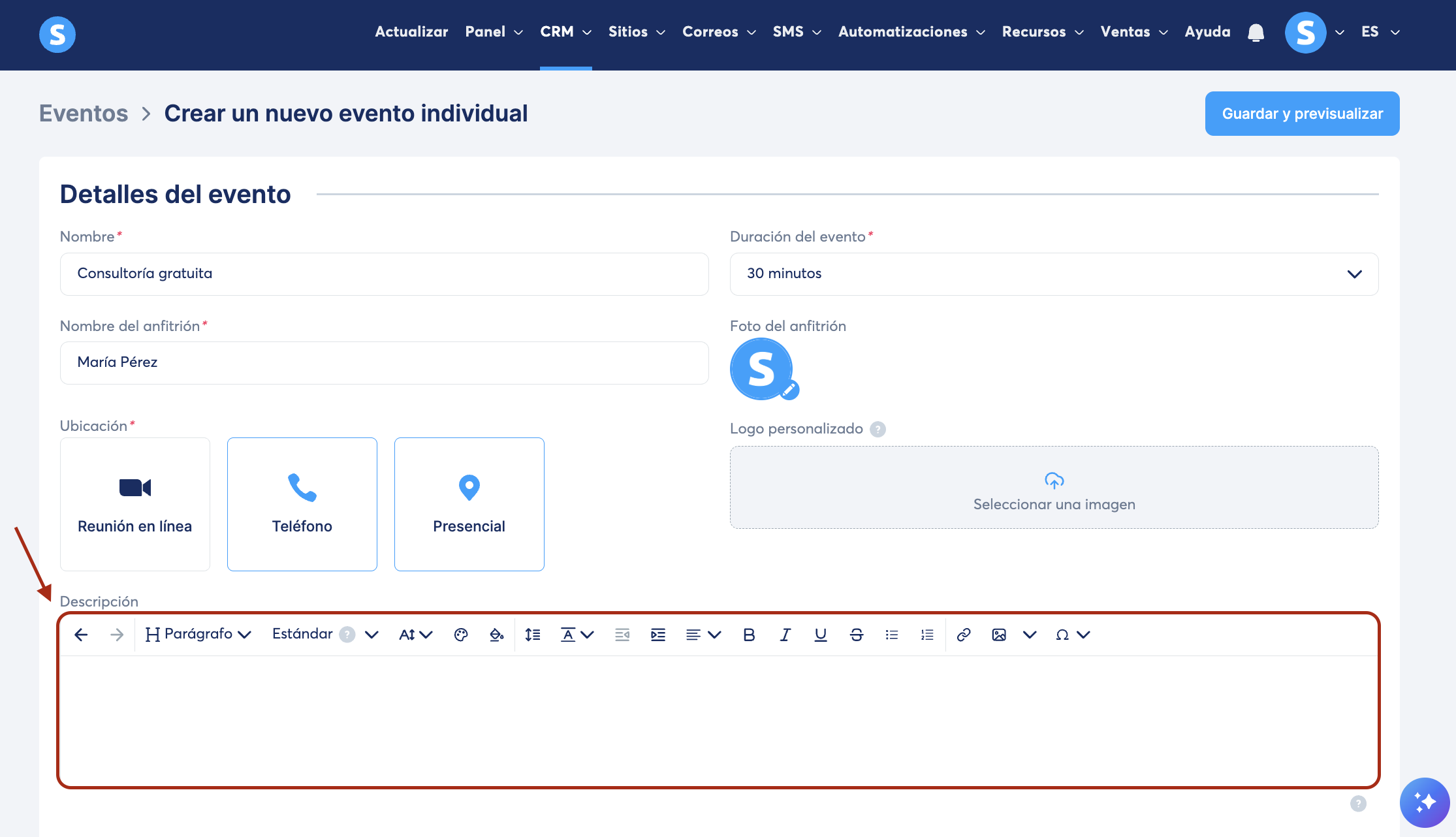 Ejemplo de eventos: "Consulta gratuita" o "Sesión técnica".