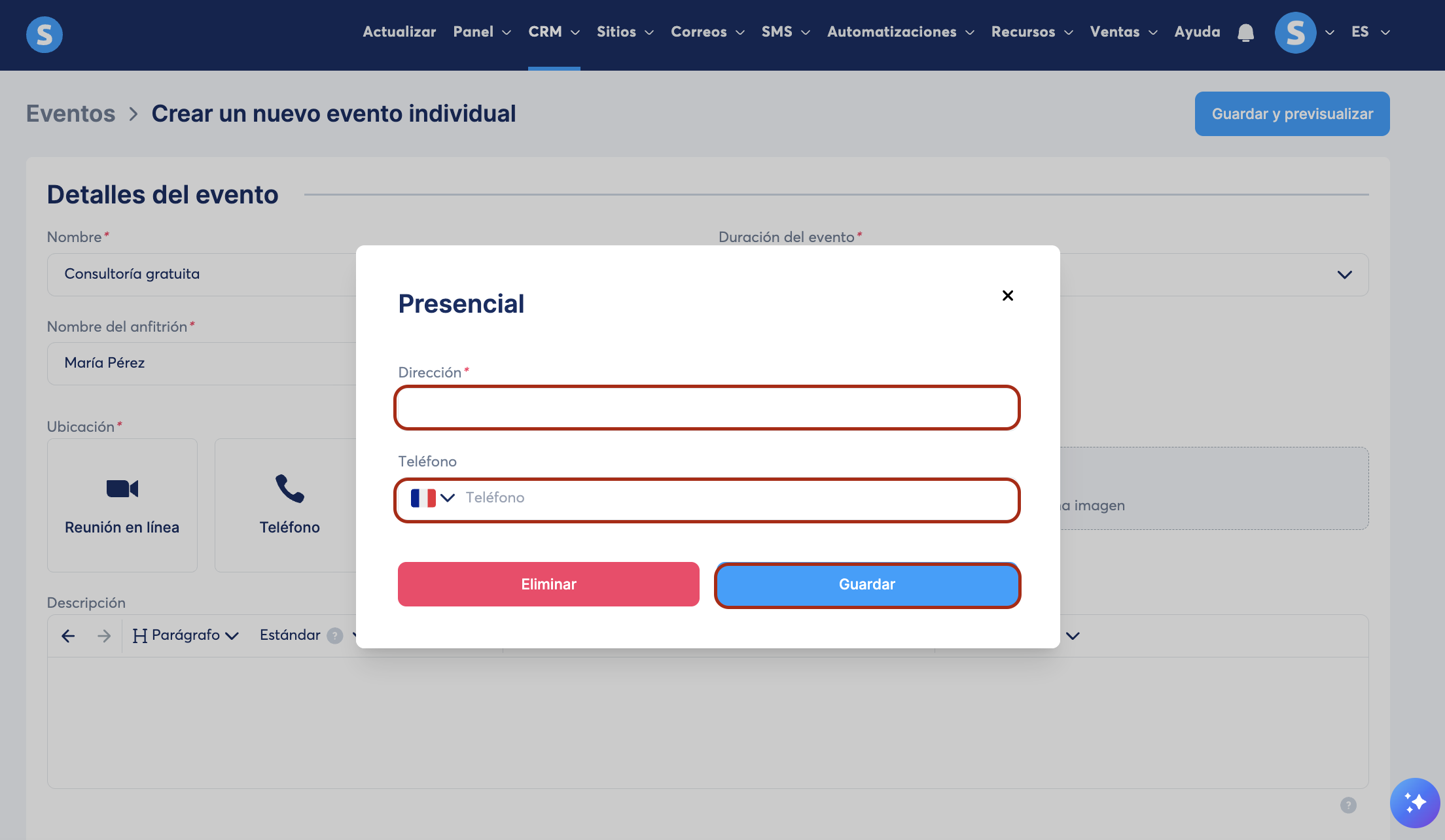 - Presencial: agrega una dirección física y un número telefónico.