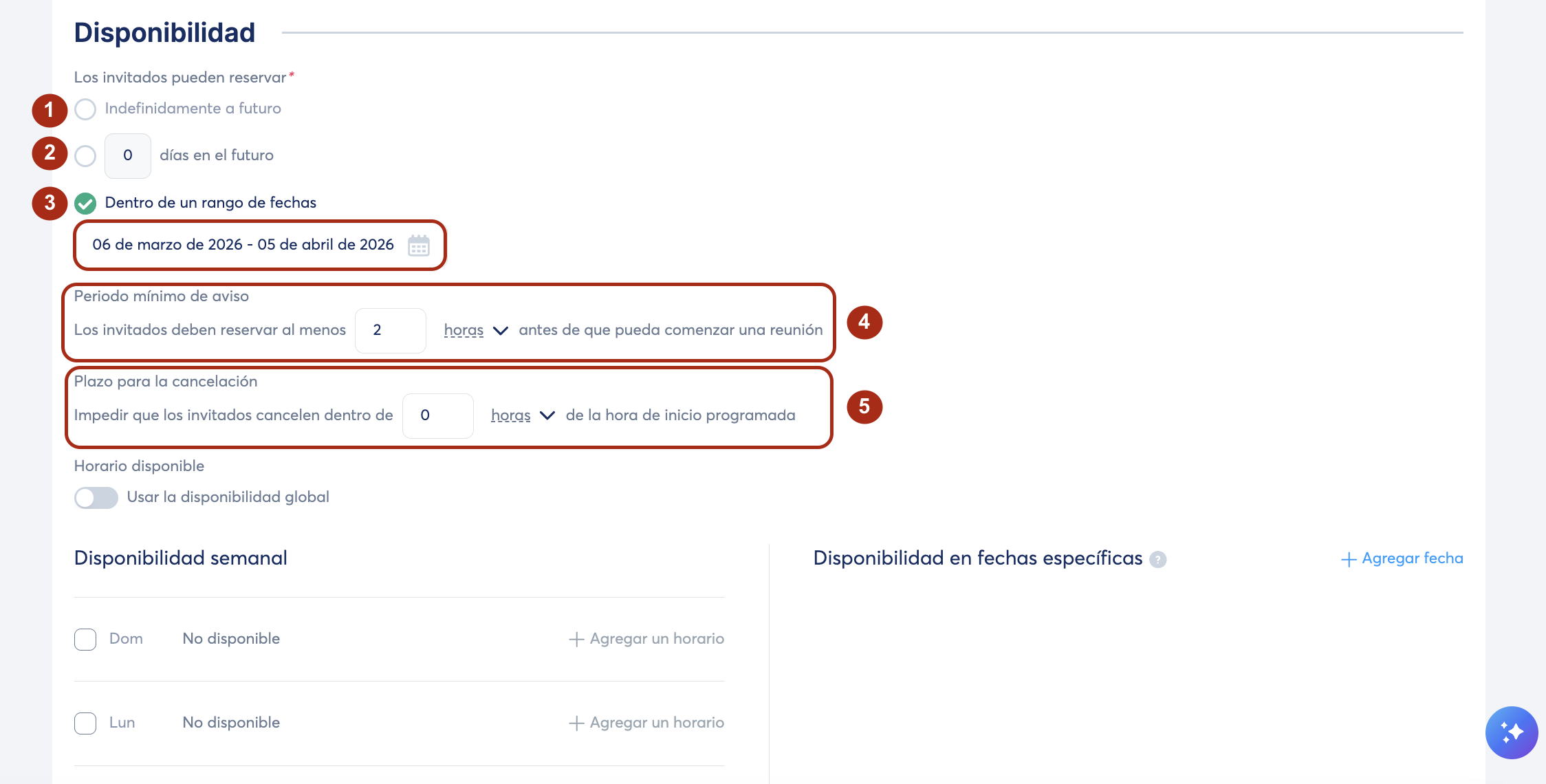 Puedes establecer manualmente la disponibilidad o usar la configuración de tu disponibilidad global al activar la opción de Usar la disponibilidad global.