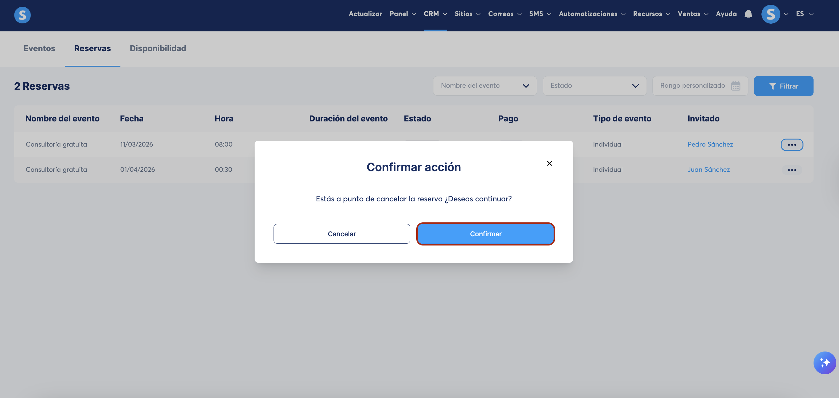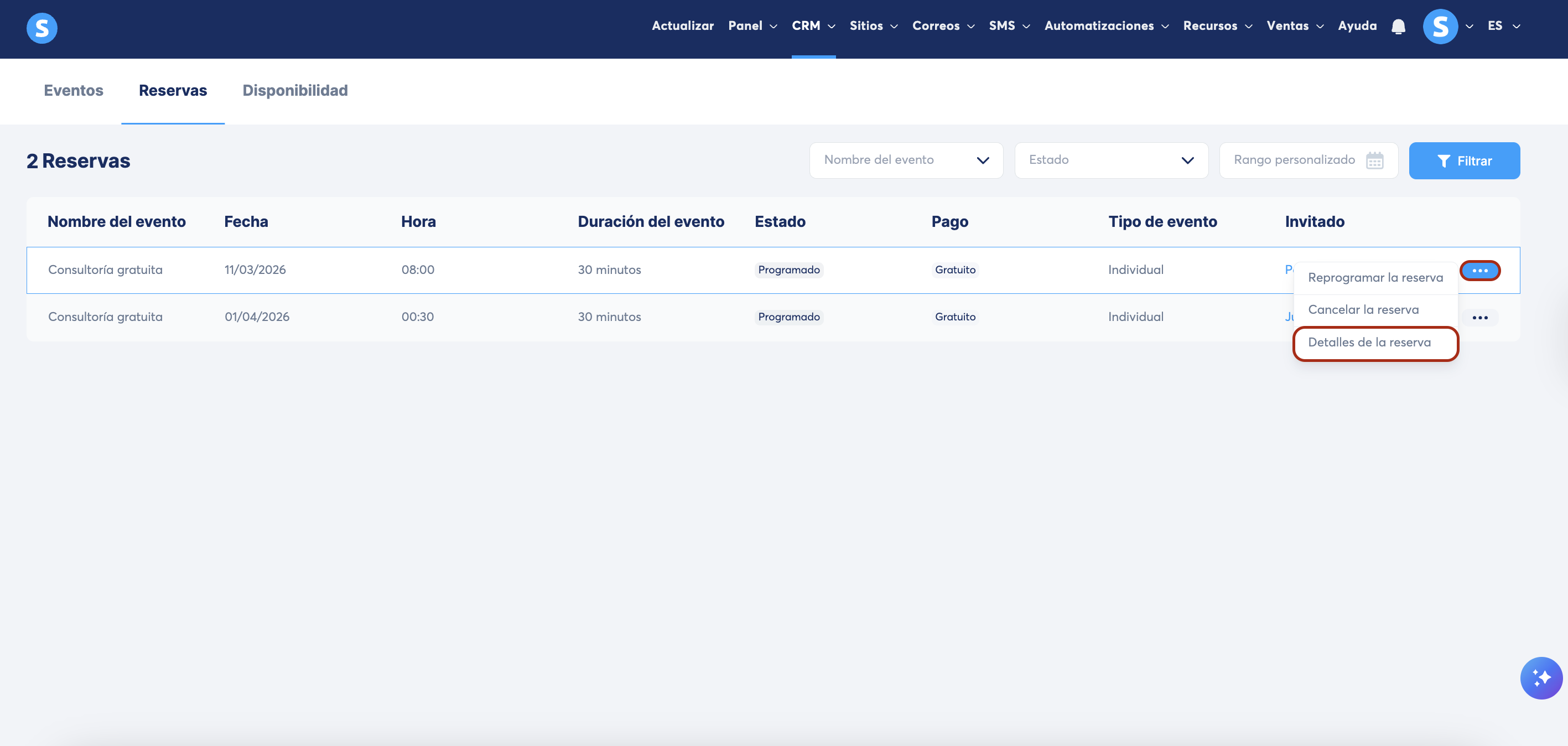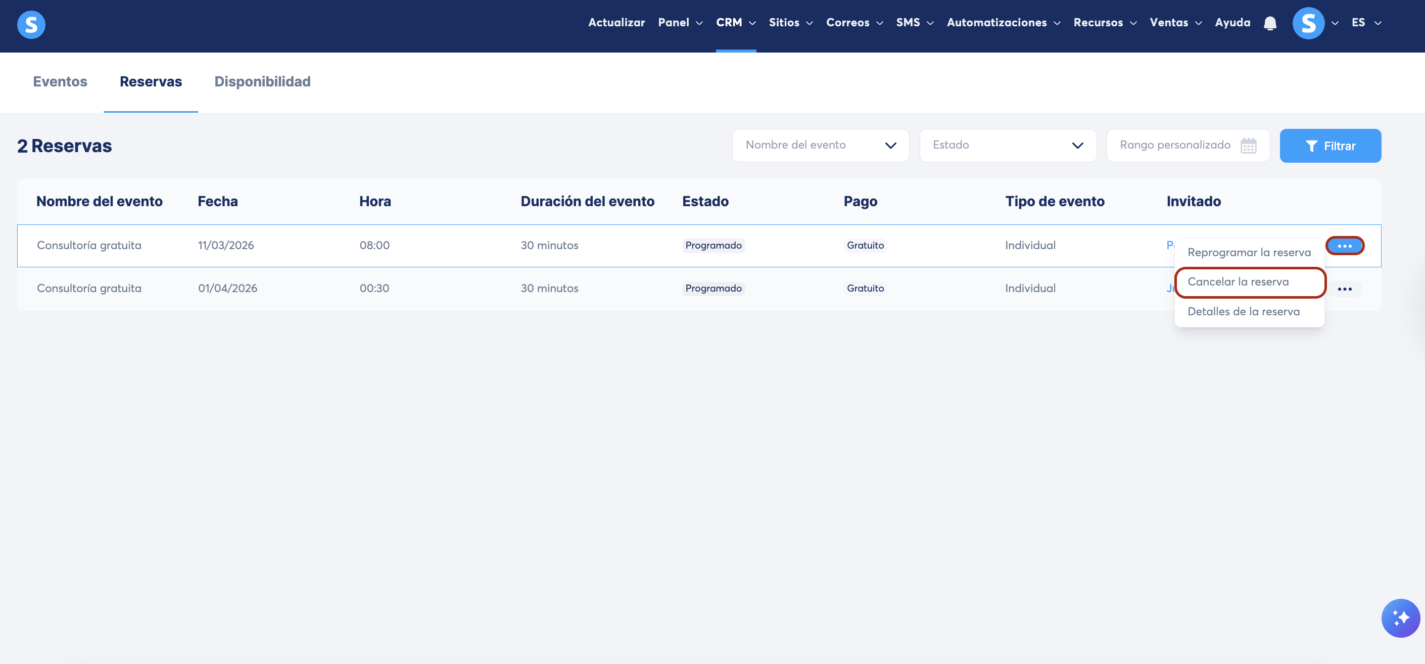 Esta pestaña te permite gestionar todas las reservas realizadas a través de tus calendarios.
