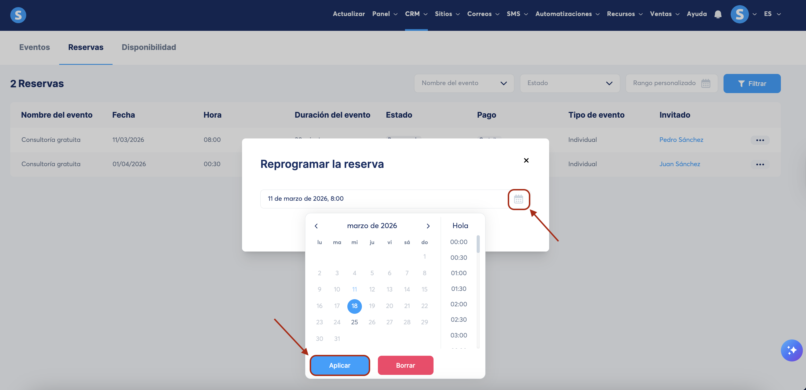 Selecciona la fecha y hora deseada para la reprogramación de la cita y haz clic en Aplicar para confirmar.