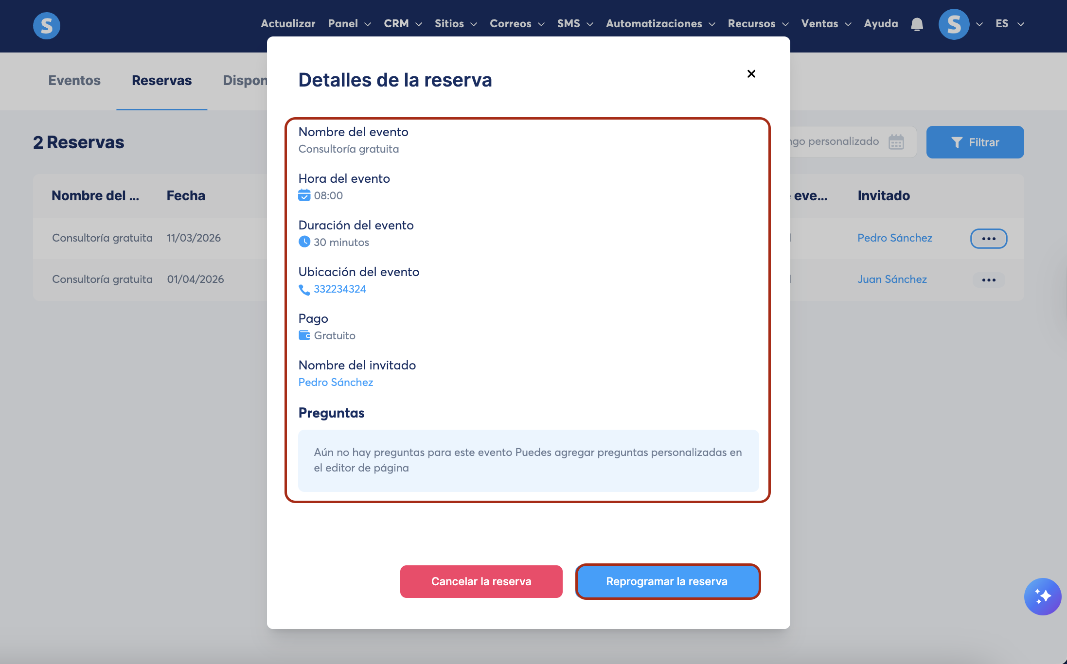 Aparecerá una ventana emergente mostrando los detalles de tu reserva. También puedes cancelar o reprogramar la reserva desde esta ventana.